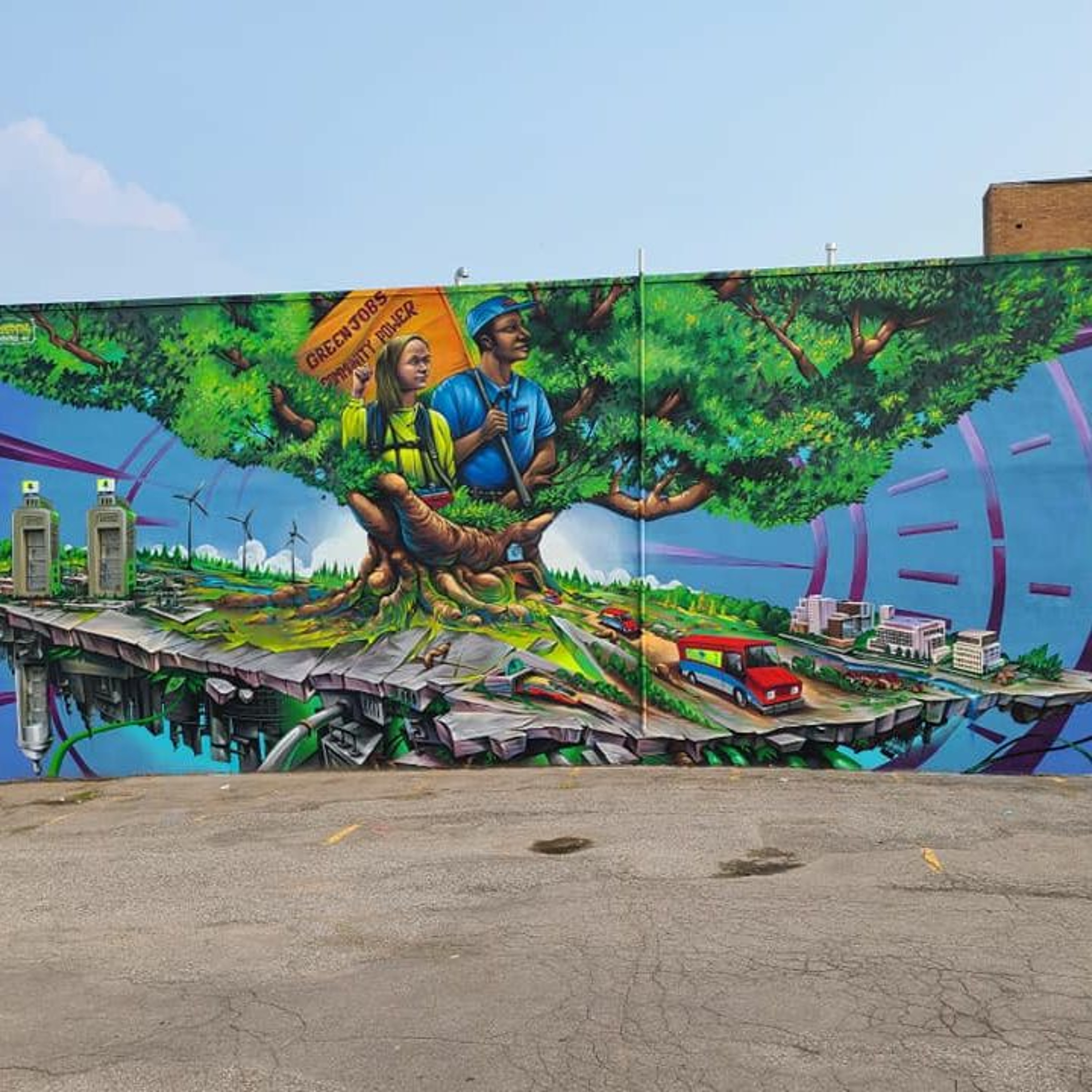 Stefan speaks with members of School for Climate, Green Jobs Oshawa, the Canadian Union of Postal Workers, Iron + Earth and the Council of Canadians about a fresh climate mural in Oshawa.