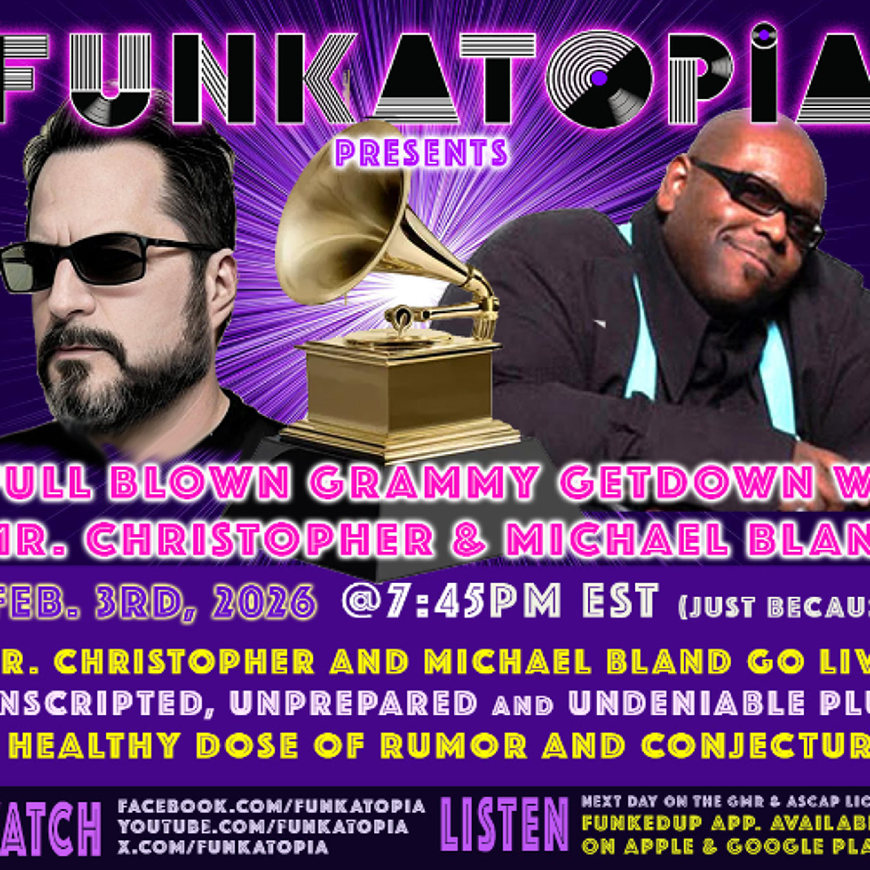 Mr. Christopher and NPG legend Michael Bland discuss the 2026 Grammy Awards covering the major highlights including political statements, D'Angelo, Roberta Flack, Jellybean Johnson, and more. It's a breakdown as only the Funkatopia dynamic duo can do it.