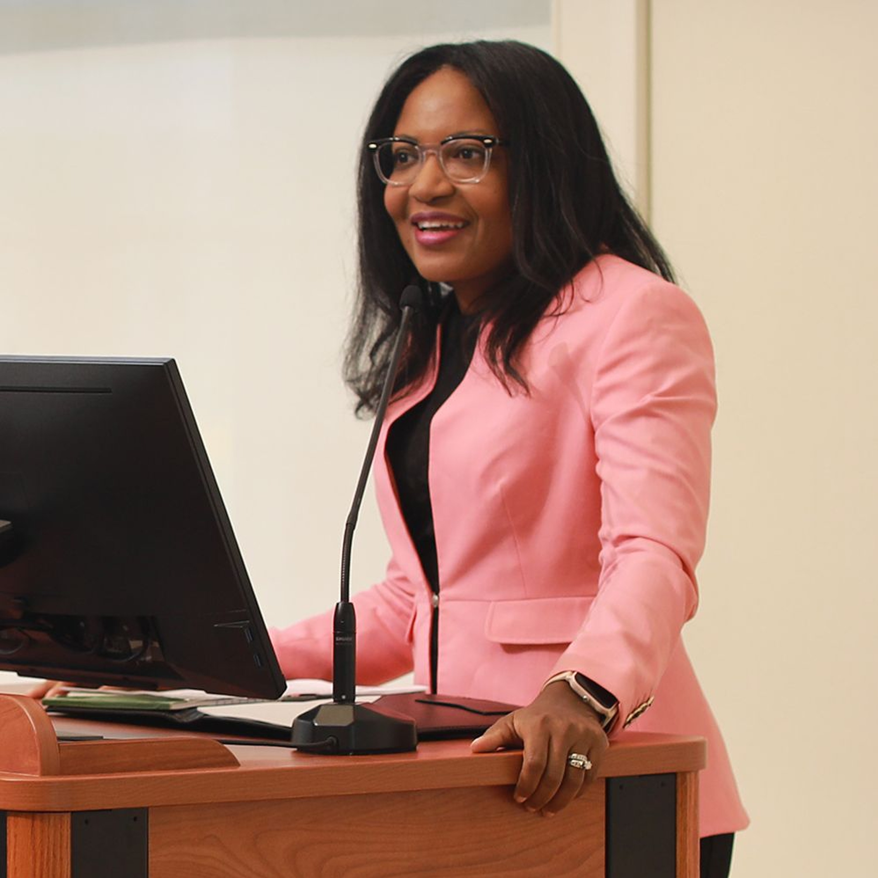 Terrica Redfield Ganzy ’02, executive director of the Southern Center for Human Rights, spoke about the importance of public service in her life at the Public Service Kickoff. Dean Leslie Kendrick ’06 and Assistant Dean for Public Service Ryan Faulconer ’08 introduced Ganzy. (University of Virginia School of Law, Aug. 27, 2024)