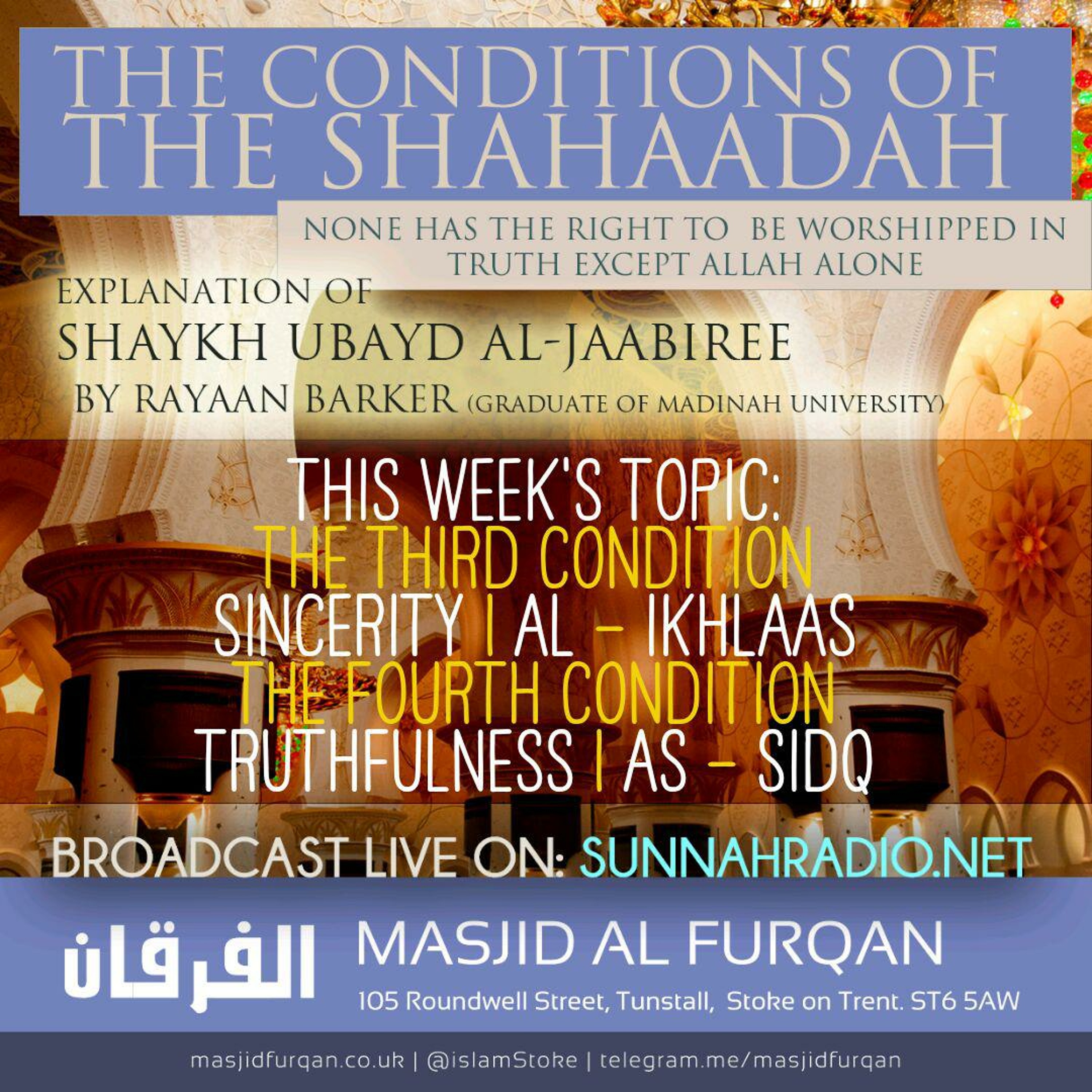 This audio starts with the condition of al-Ikhlaas (Sincerity) and also covers the condition of as-Sidq (Truthfulness). It is imperative for a Muslim to have sincerity so that all actions are performed sincerely for Allah's sake alone and to negate all forms of Shirk. Truthfulness is likewise important to ensure that a Muslims's Testimony of Faith is actualized based upon him/her being true to it and acting upon all that it entails.