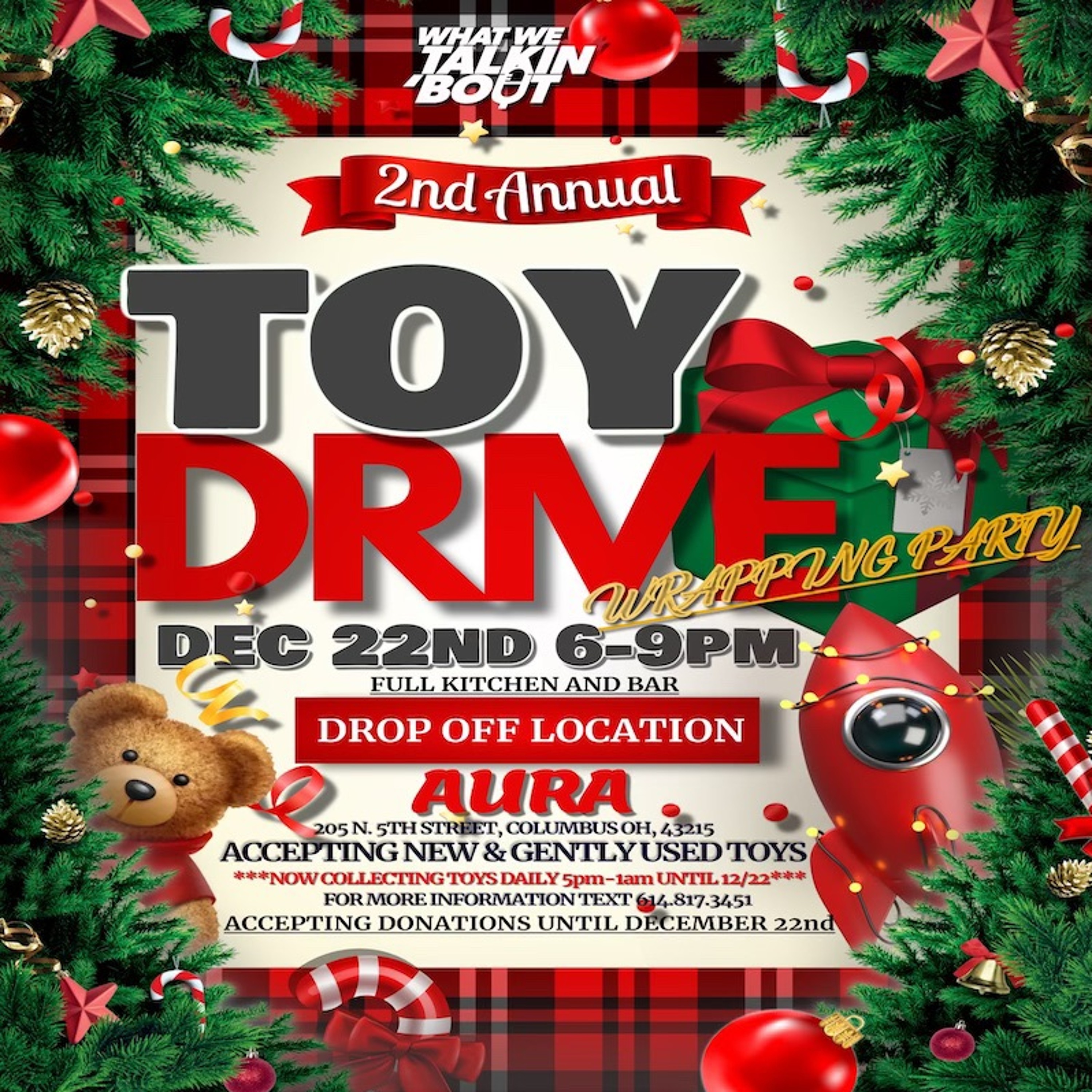 We are excited to announce the 2nd Annual @whtwetalkinbout Toy Drive and Wrapping Party Dec 22nd 6pm. We’ve teamed up with @aura_614 & they will serve as the drop off site for toy donations & will be the site for the official wrapping party to conclude the toy drive. We are asking for NEW and GENTLY USED toys. We need toys for boys & girls ranging from ages 3-12yrs old. We are also looking for volunteers to help with wrapping the toys. Toy drop offs are open now Mon-Sunday 5pm-1am up until Dec 22nd at @aura_614 During the wrapping party on Dec 22nd a full kitchen & bar will be available. Come out for a great cause & let’s make the holidays special for as many as possible. Thank you! For additional details text 614.817.3451 🎁