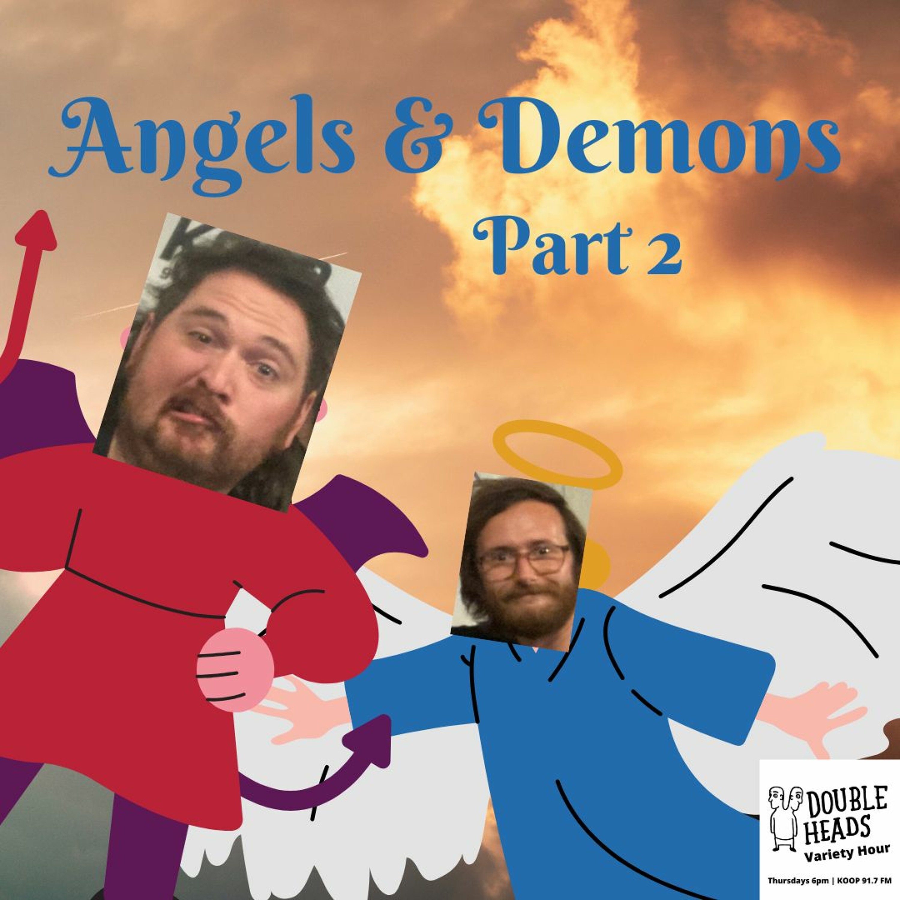 Double Heads Variety Hour presents "Angels & Demons Part 2," where DJs Dillon Minacci and Matt Fox present a playlist combining metal and gospel. They meet an ad executive, impersonate celebrities, and challenge callers to pitch their own PSAs.