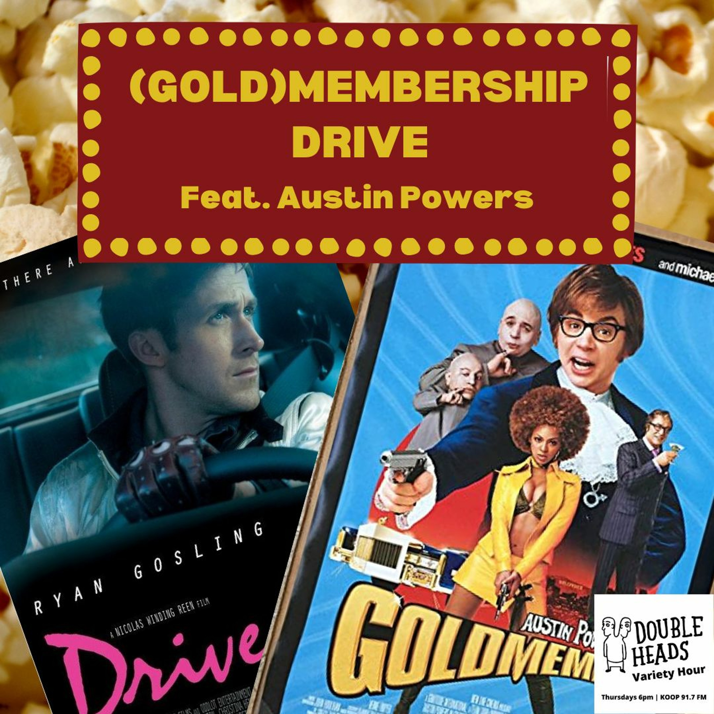 Double Heads Variety Hour presents "(Gold)membership Drive," where DJs Dillon Minacci and Matt Fox present a playlist combining songs from the films Drive and Goldmember. They hang out with Austin Powers, raise money for KOOP, and get summoned to court.