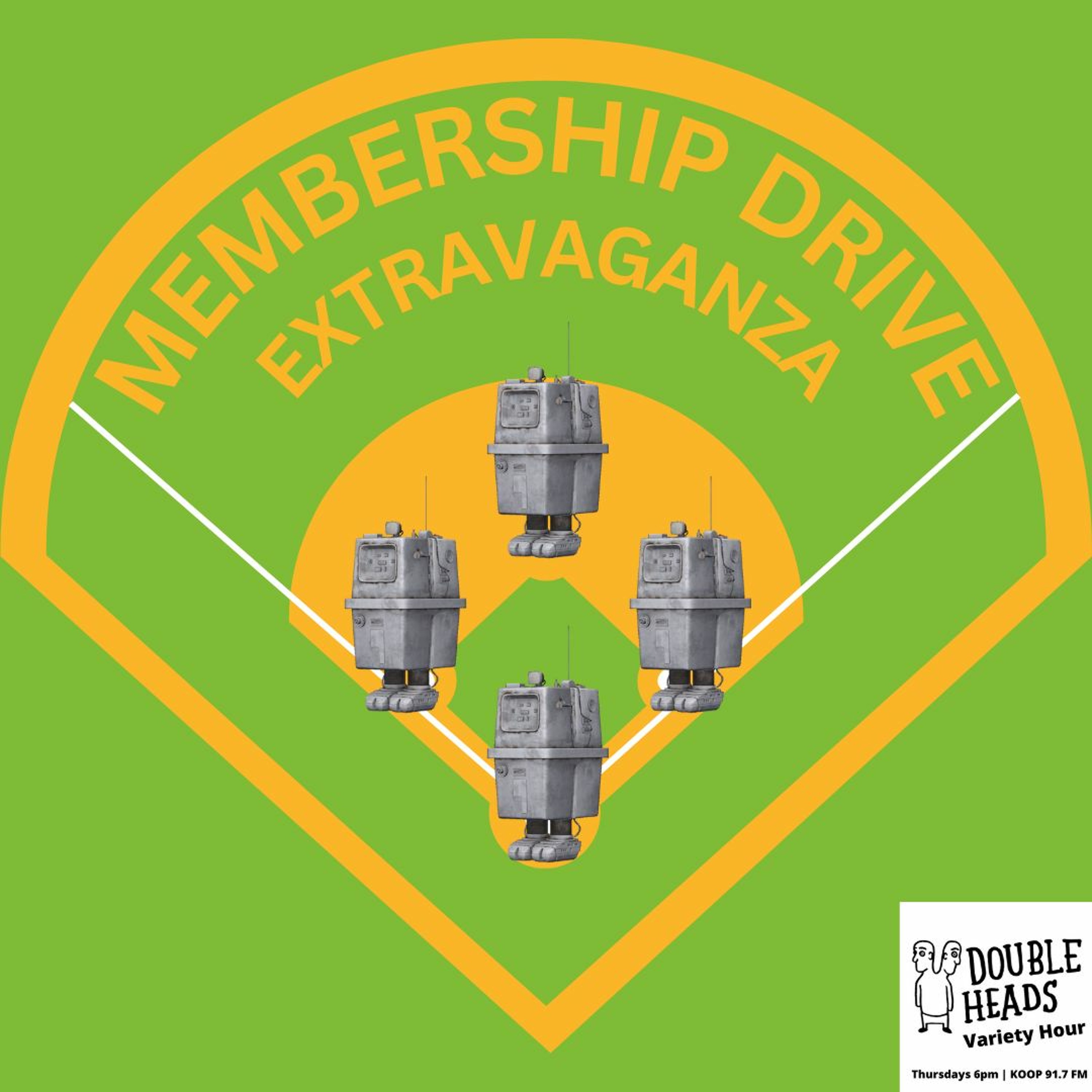 Double Heads Variety Hour presents "Membership Drive Extravaganza," where DJs Matt Fox & Dillon Minacci present a playlist combining disco and baseball music. They install a new robot, teach him how to fundraise, and weight the pros and cons of assassinations.