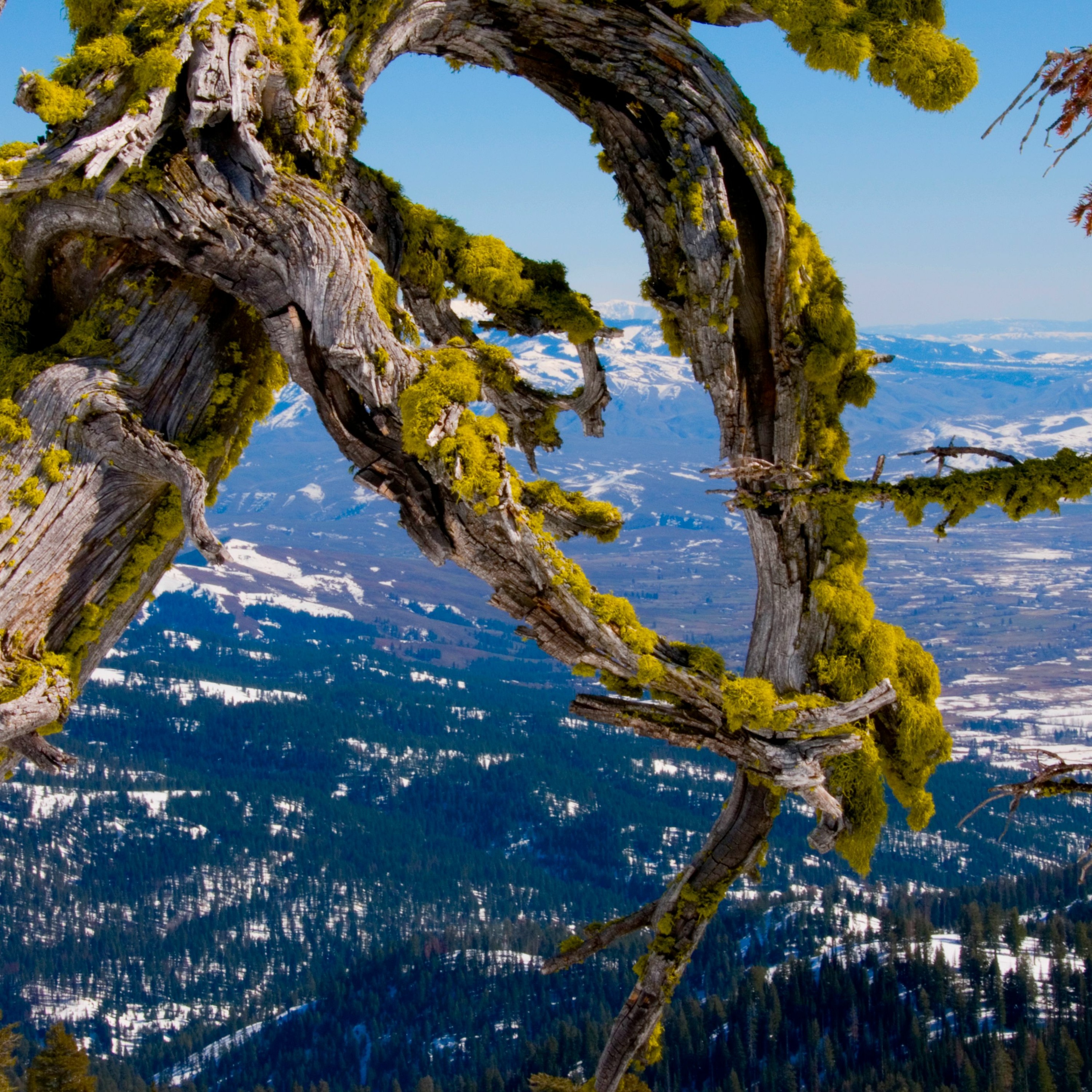 IMAGE: An ancient Whitebark Pine snag, some 1400 meters above the snowy valley floor below, OREGON.