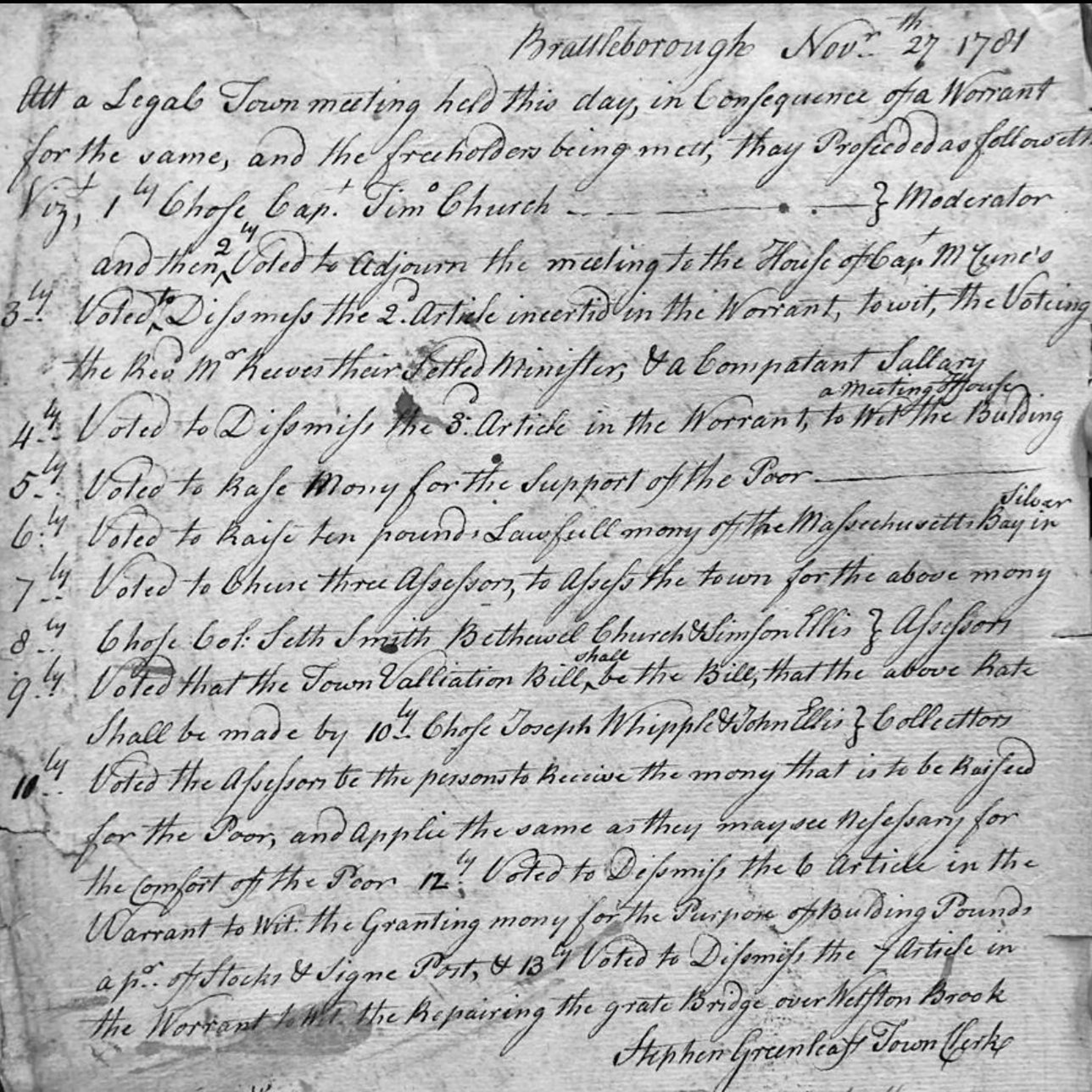 In 2008 Walter Meyer donated handwritten minutes of four Brattleborough Town Meetings to the historical society. They date from 1781 and 1782. The minutes were recorded by Town Clerk Stephen Greenleaf. We summarize the actions of the freeholders in this recording...