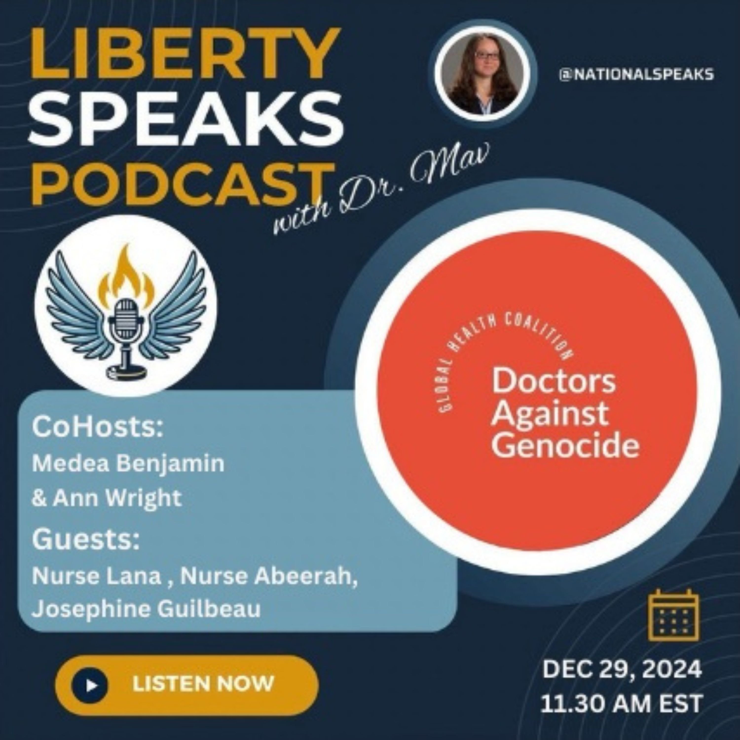 Join Dr. Mav with Co-hosts Medea Benjamin and Ann Wright to discuss Doctors Against Genocide and the upcoming press conference about destruction and conditions at the hospitals in the war zone. Ann Wright is a retired US Army Colonel and US diplomat, who Resigned in Opposition To US War On Iraq. She has been To Gaza eight times and is a part of the of the Gaza Freedom flotilla and in Israeli jail twice.Medea Benjamin is the co-founder of the women-led peace group CODEPINK. Medea has been an advocate for social justice for 50 years. She is the author of 11 books, including Drone Warfare: Killing by Remote Control, Kingdom of the Unjust: Behind the U.S.-Saudi Connection, Inside Iran: The Real History and Politics of the Islamic Republic of Iran and War in Ukraine: Making Sense of a Senseless Conflict, coauthored with Nicolas J.S. Davies. Her most recent book, coauthored with David Swanson, is NATO: What You Need to Know. Joining them are Nurse Abeerah, Nurse Lana and Josephine Guilbeau. In February 2024, Nurse Lana participated in a life-changing medical mission trip to Gaza, providing critical care to those affected by the humanitarian crisis. Witnessing the devastating impact of violence and systemic injustice, she has since become a passionate voice for global health equity and human rights. Combining her nursing expertise with her commitment to advocacy, Nurse Lana strives to make a meaningful difference both locally and internationally. Nurse Abeerah traveled to Gaza on a medical mission in May 2024. Dedicated to providing care amidst a humanitarian crisis, her journey took an unexpected turn when she was stranded for an additional week due to the Israeli invasion of the Rafah border. Despite the challenges, Nurse Abeerah remained steadfast in her commitment to serve, witnessing firsthand the profound impact of war on vulnerable communities. Her experience deepened her resolve to advocate for justice, equity, and the well-being of those in conflict zones. Nurse Abeerah also volunteered in the emergency department at European Gaza Hospital.Josephine Guilbeau Eisenhower Media Fellow; 17 yr Veteran Frm Captain - Intelligence officer. For the past year, Josephine has volunteered her time to bring awareness to the current situation in Gaza to political leaders, influential leaders, and social media platforms. We will re stream the livestream of the Doctors Against Genocide Press Conference/Webinar at noon and have pre and post discussions. https://us06web.zoom.us/webinar/register/WN_L-PfeDasSOWR2BHcAwTV2A#/registration