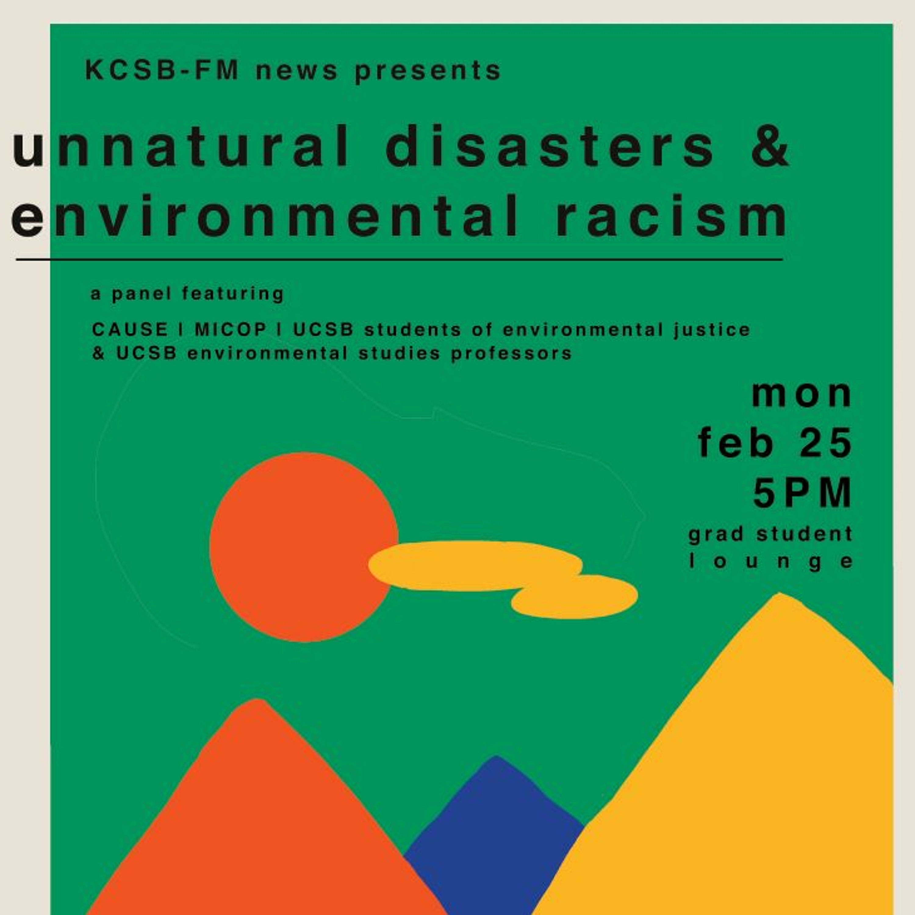 KCSB News presented a panel on Monday , February 25th, 2019 regarding the implications of (un)natural disasters on marginalized communities due to non-inclusive and outdated policies. The panel featured representatives from the UCSB Environmental Studies Department, UCSB Students for Environmental Justice, Mixteco/Indigena Community Organizing Project (MICOP), Central Coast Alliance for a Sustainable Economy (CAUSE) and the Santa Barbara County Board of Supervisors. This event focused on case studies and their impact on communities, as well as collaborative efforts in moving forward - envisioning how policy makers and government responses can include marginalized communities.