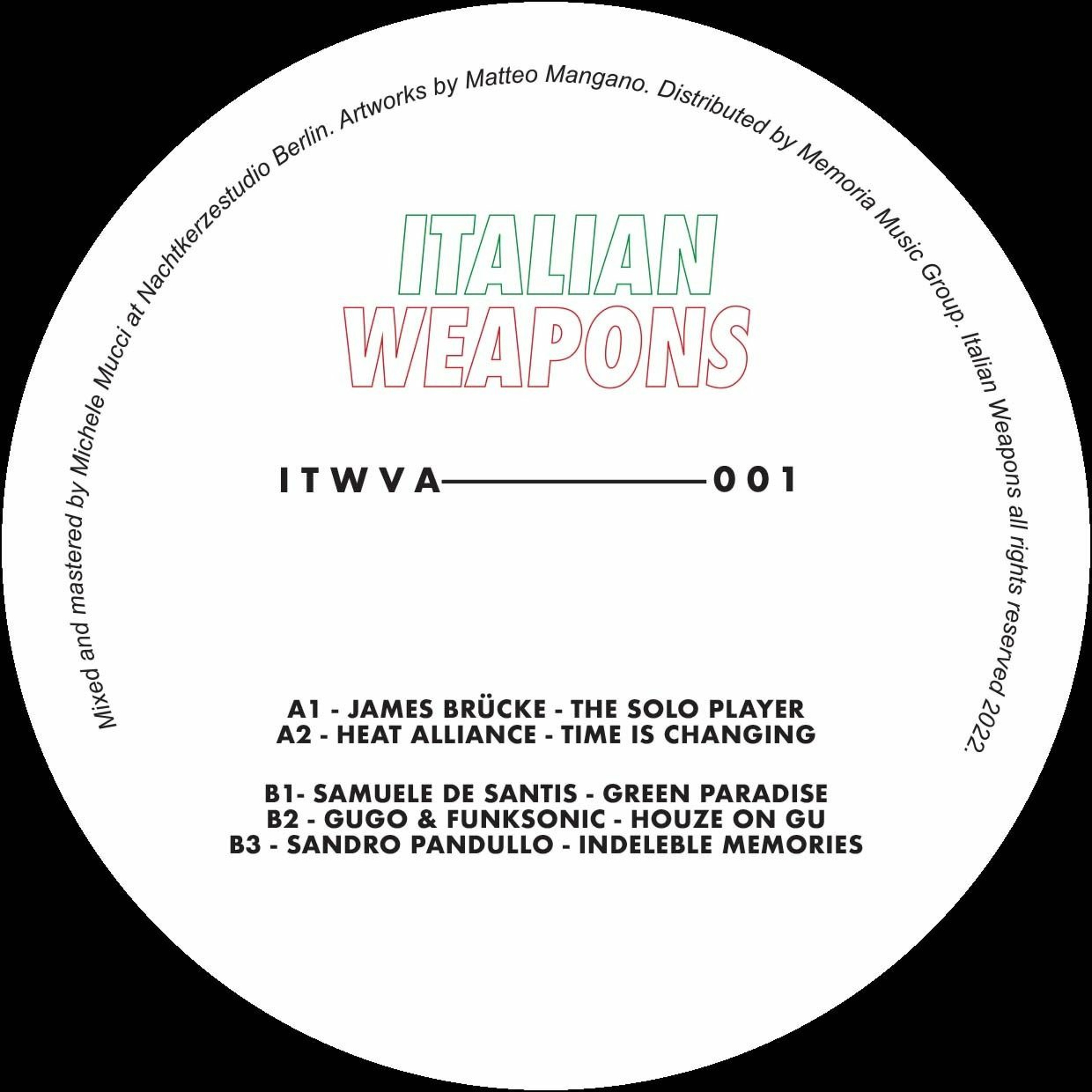 ITWVA001 Includes 5 tracks carefully selected by the Italian Weapons label. Owned by Niccolo Turini and Gunther Mian. These tracks were mastered by Michele Mucci of Nachtkerzestudio Berlin. The first various artist ranges through all the nuances of Italian house music produced by artists located throughout the country and beyond.