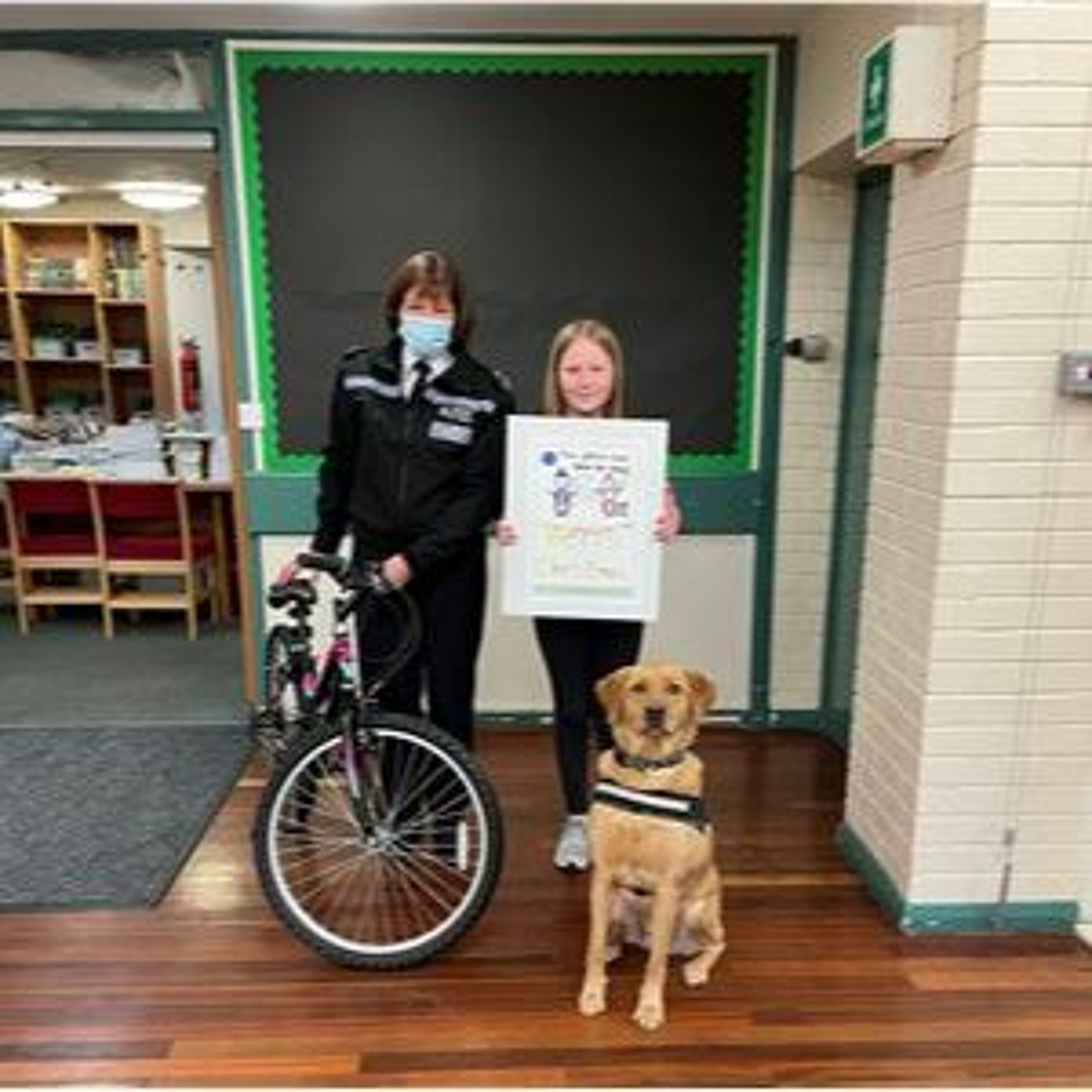 Photo: Chief Constable Jo Farrell presents 10 year old Freya Crawford, a student at Peases West Primary School in Billy Row, Crook with a mountain bike as first prize in the Constabulary's Christmas Card Competition.