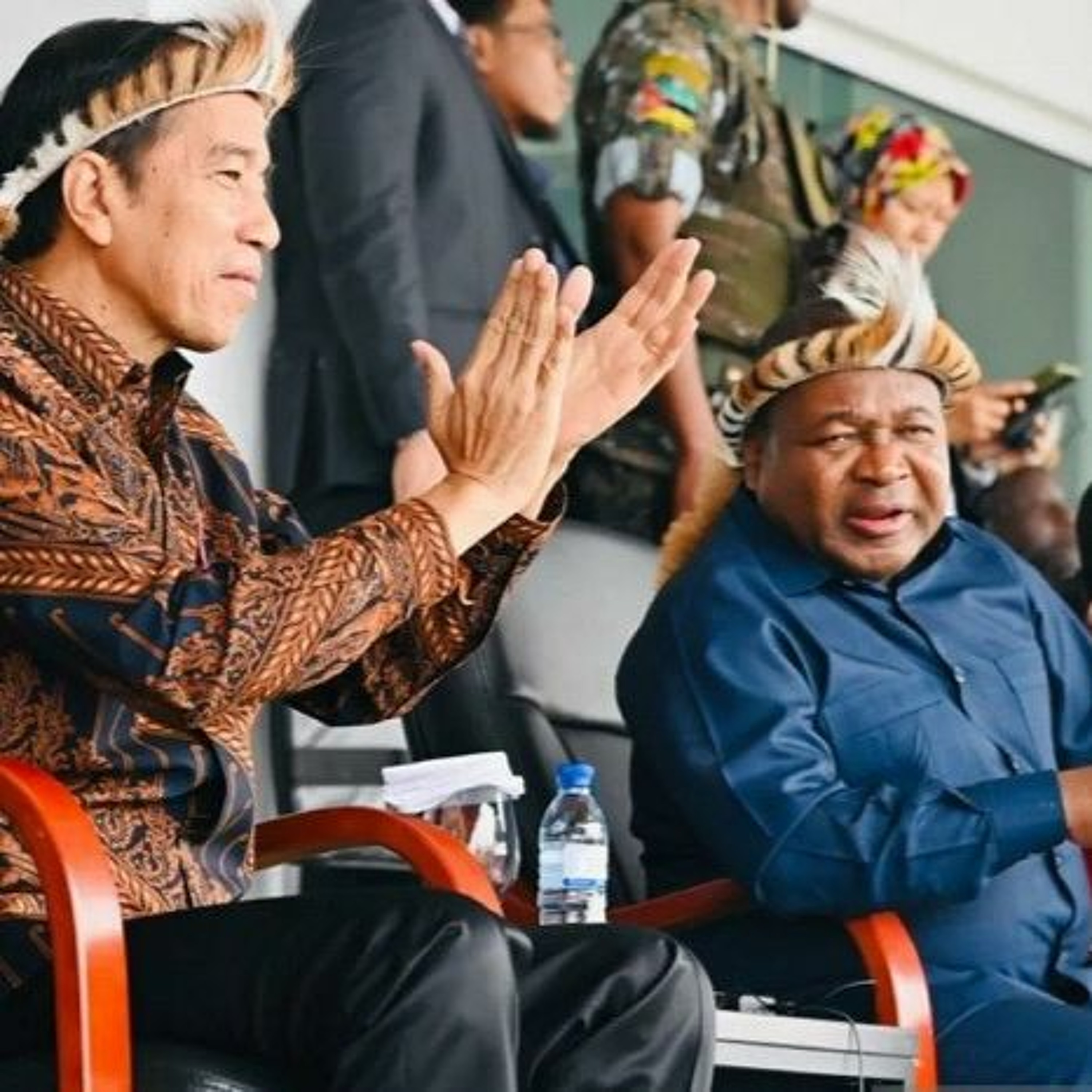 Caption: President Joko “Jokowi” Widodo (left) and his host Mozambique President Filipus Nyusi wear traditional headbands as they attend the opening of the National Festival of Culture at Red Bulls Association Field in Maputo on Aug. 23, 2023.