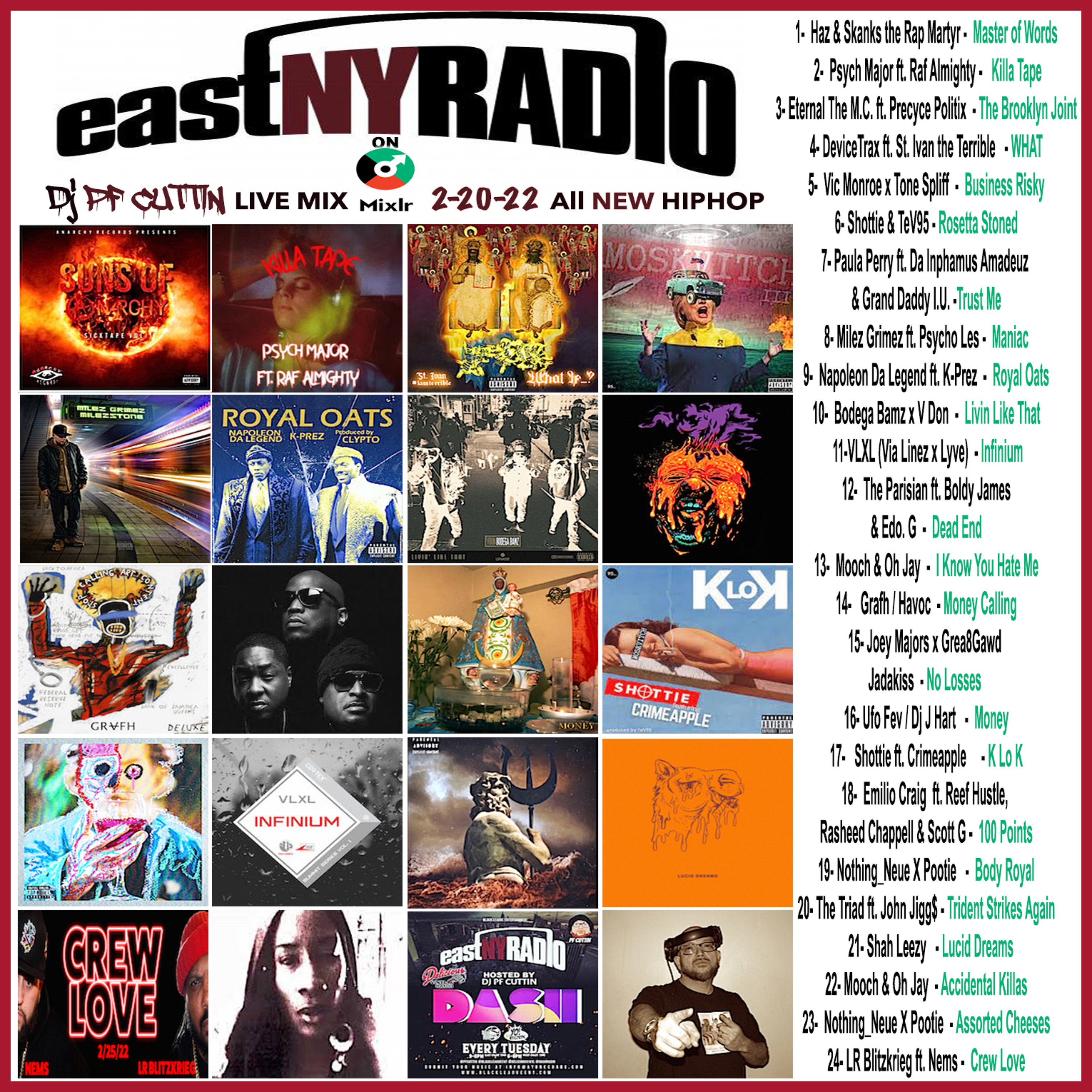 Pf Cuttin comes thru with this all New Hip Hop mix for the week of 2-20-22. Taken from his live show on Mixlr . Here the link to his live page. https://mixlr.com/pf-cuttin/