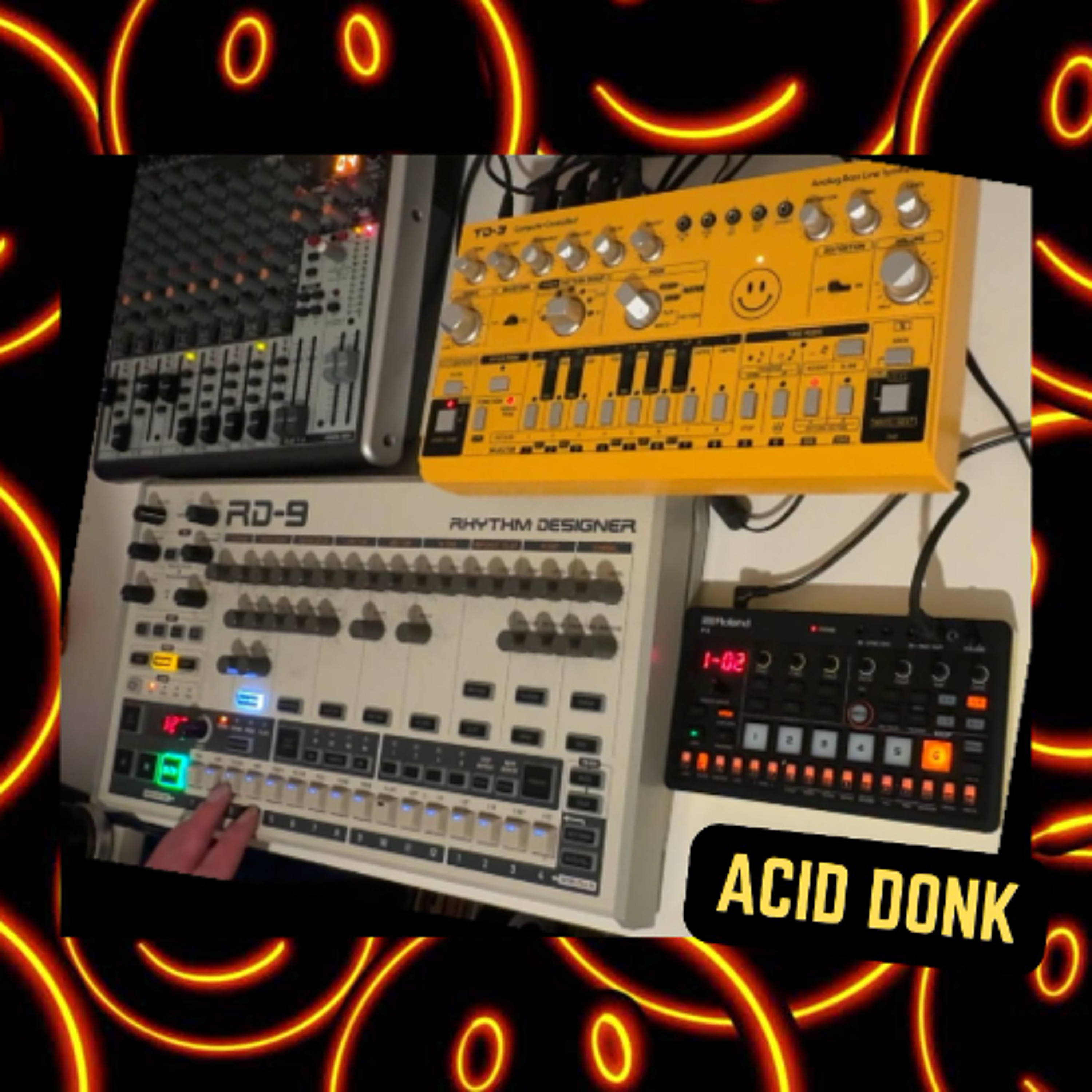 Oldskool TECHNO vibes. Behringer RD-9 drum machine ( 909 ) , TD-3 the ‘acid’ and bass ( 303 ) Roland p-6 sampler for that distinctive DONK bass and other samples.