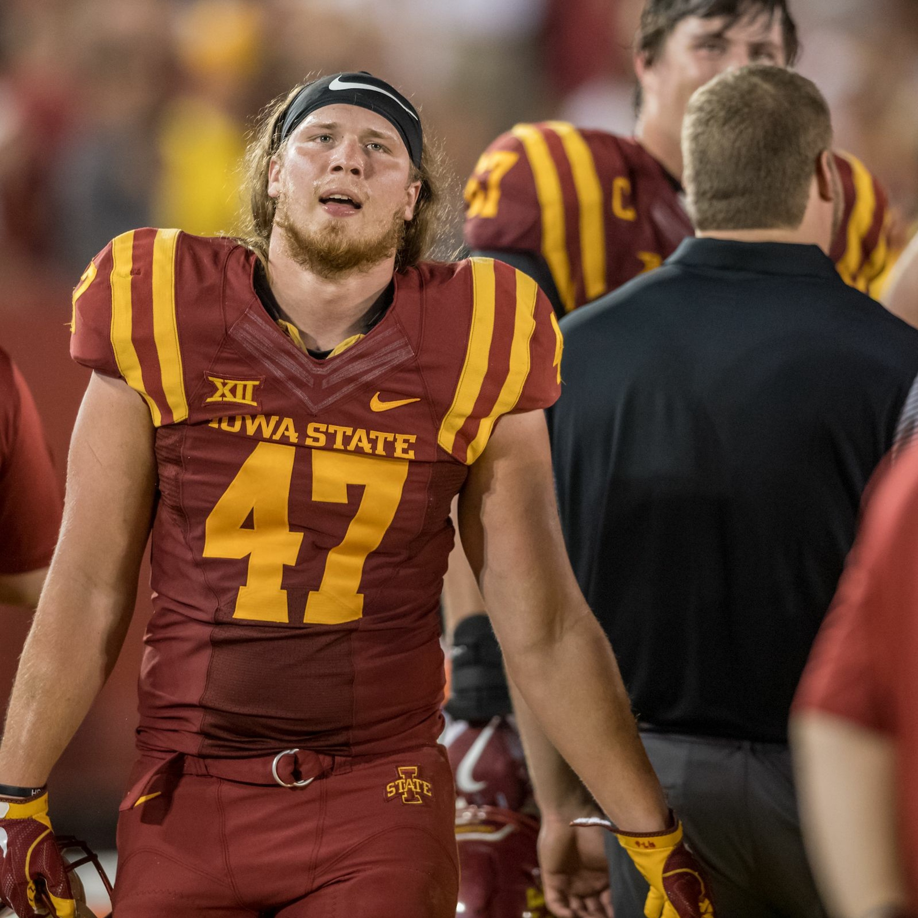 Iowa State fullback Sam Seonbuchner visits with John Walters.