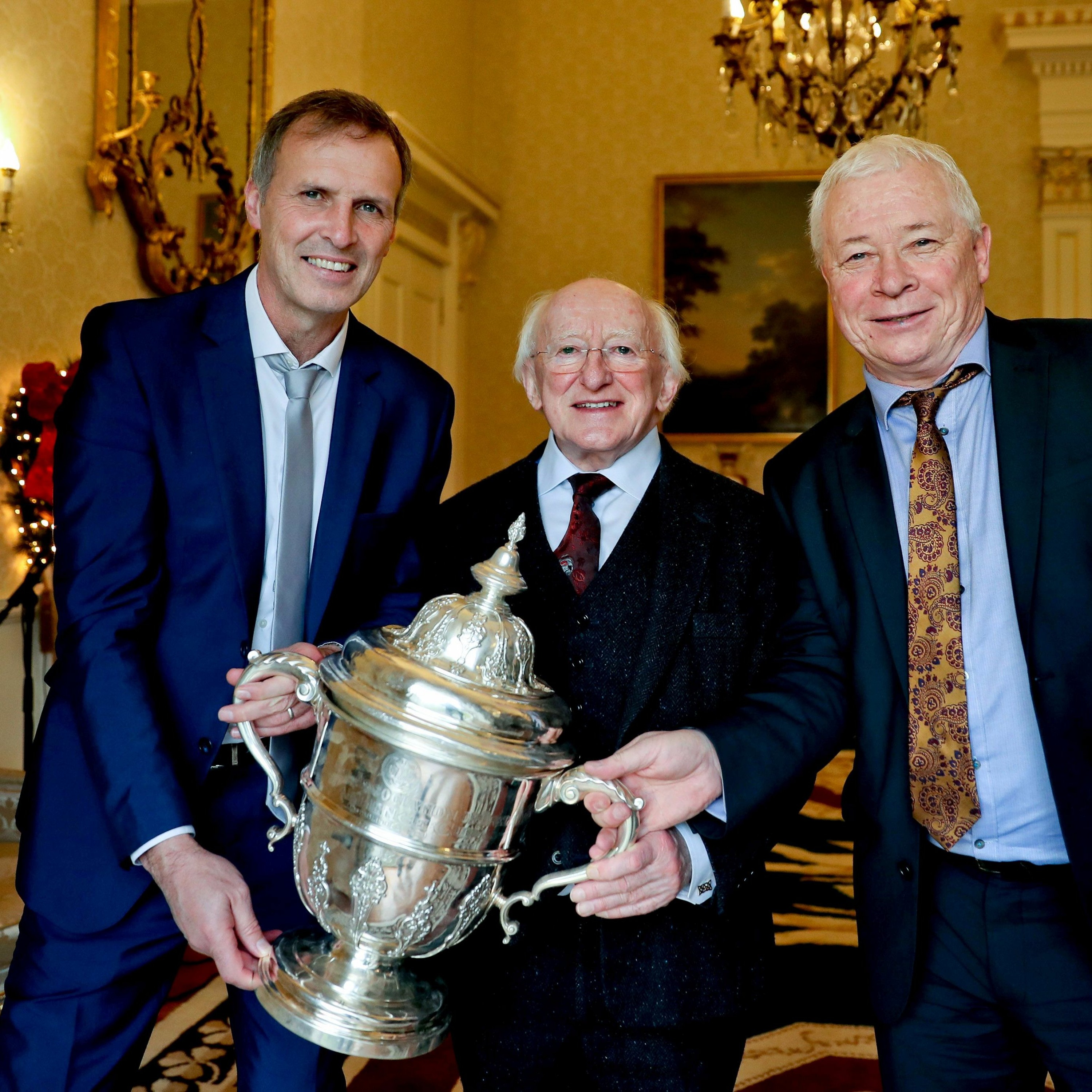 To celebrate the 25th anniversary of their 1991 victory in the FAI Cup, President Michael D. Higgins hosted a reception for the Galway United team's players, coaches and families at Áras an Uachtaráin.