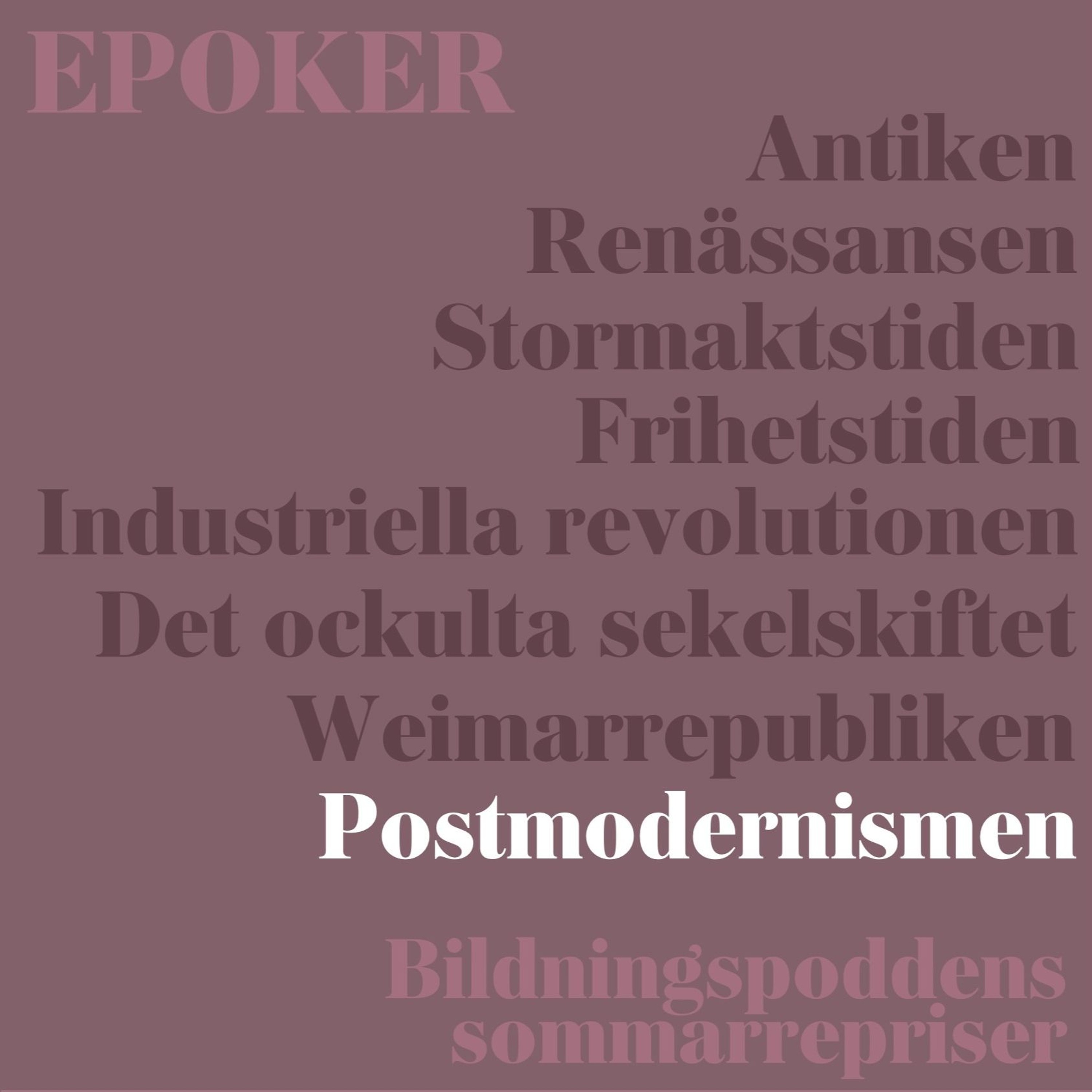 Det brukar heta att vi lever i postsanningens tid. Att falska nyheter, filterbubblor och allmän värderelativism alltmer definierar vårt samhälle. Med jämna mellanrum dras ”postmodernismen” fram som en bov i dramat. Men vad var egentligen postmodernismen? Det korta svaret är: en konstriktning och en filosofisk tanketradition som växte fram under 60-, 70- och 80-talen och som på olika sätt utmanade föreställningen om givna sanningar. Men vad gick allt egentligen ut på? Hur förhöll sig den postmoderna konsten till den postmoderna teorin? Vilka är de viktigaste postmoderna idéerna? Och vad innebär det egentligen att leva i en postmodern tid? I veckans avsnitt går Bildningspodden går till botten med postmodernismen. Gäster i studion är idéhistorikern Anders Burman och litteraturvetaren Frida Beckman. Avsnittet är en repris och publicerades första gången i april 2018.