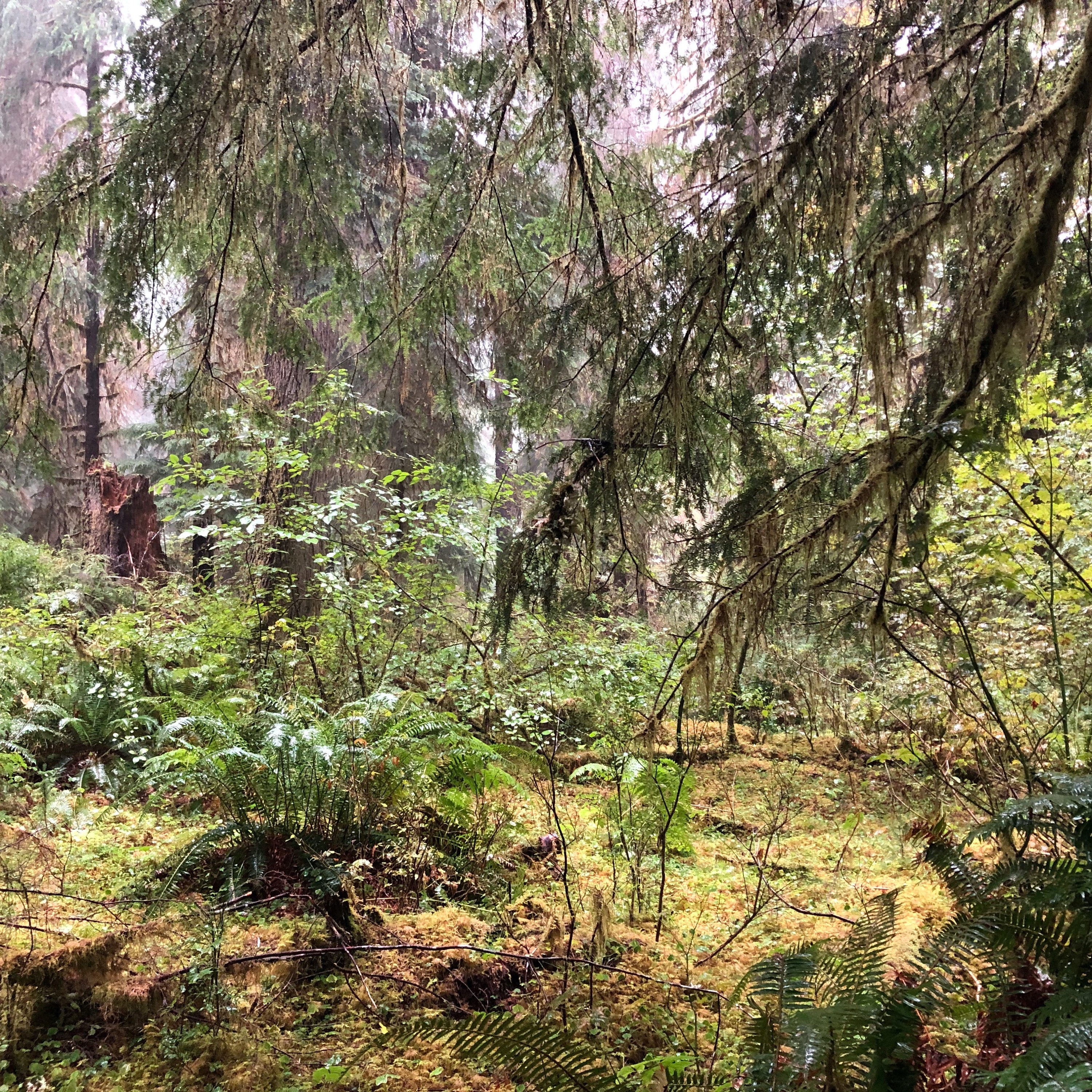 Sometimes I hear people talking about "the sound of rain in a forest" as being just a single, monolithic sound that covers the entire forest, or even all forests. To these people I suggest to Listen More. Close your eyes and take it in. No recording can do justice to feeling of being there, the smell of cedar in the air and soil beneath your feet, the feeling of water dripping down your faces and fogging your glasses, the damp chill as your clothes soak in the moisture. No recording carries with it the green all around you, the quiet elk browsing in the forest to your side, the slow falling leaves knocked from branches by hard raindrops. But still, still a recording can convey some of the subtleties of the immediate surroundings, some of the details that go into making one tree sing like another does not.