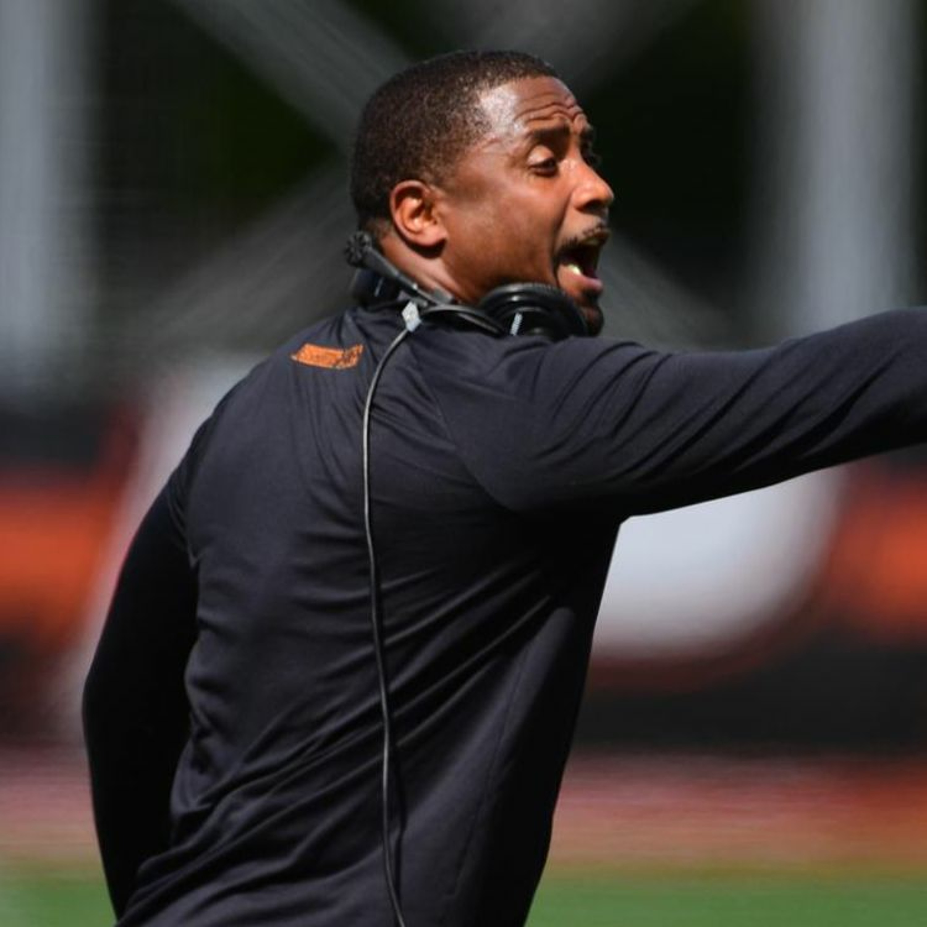 Campbell Football head coach Mike Minter chats with Evan Budrovich at Big South Media Day in Charlotte, NC.