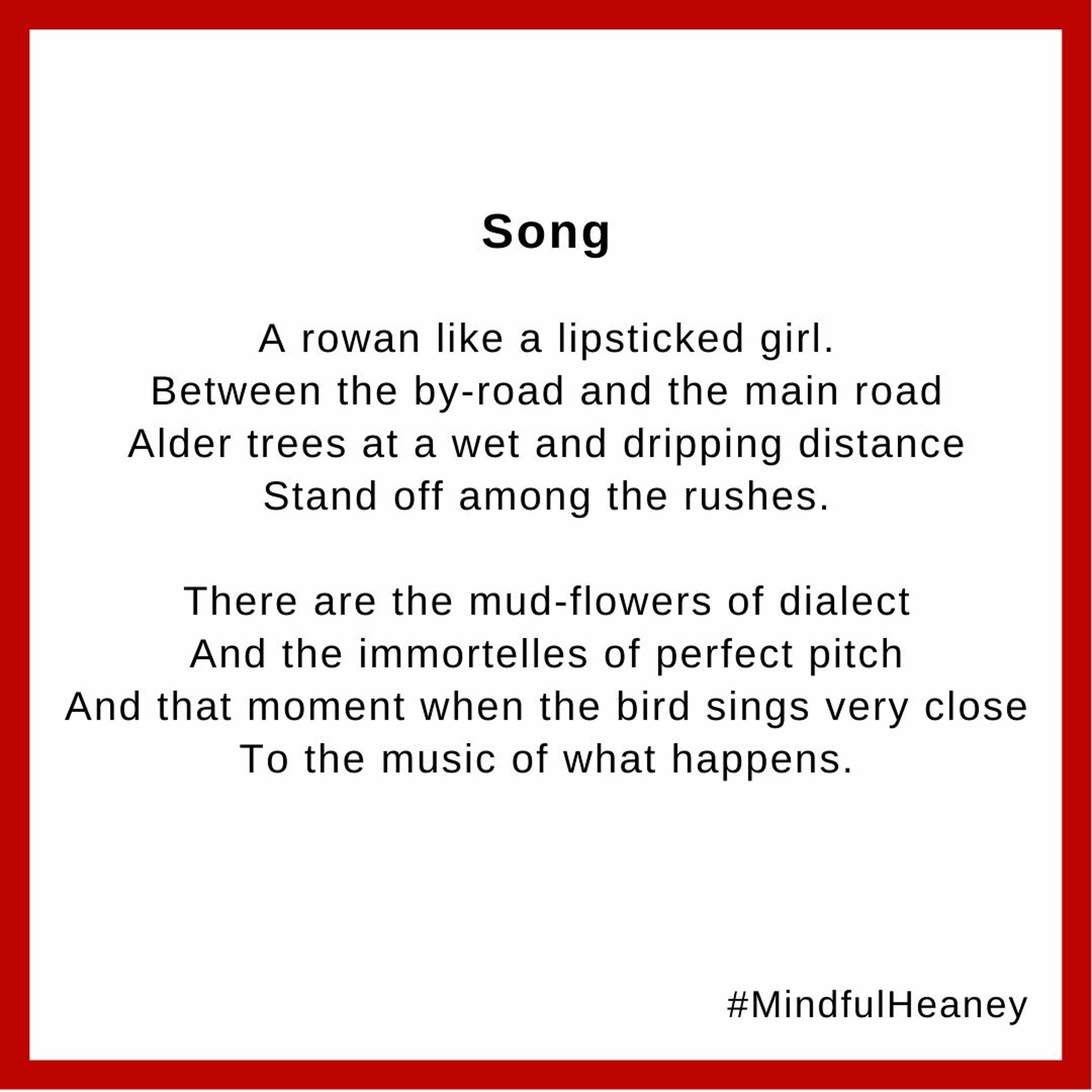 This activity is a mindful look at the poetry of Seamus Heaney. It will highlight soothing lines and images from the poem, 'Song' and encourages participants at home to take some time to find their own mindful moments in this poem.