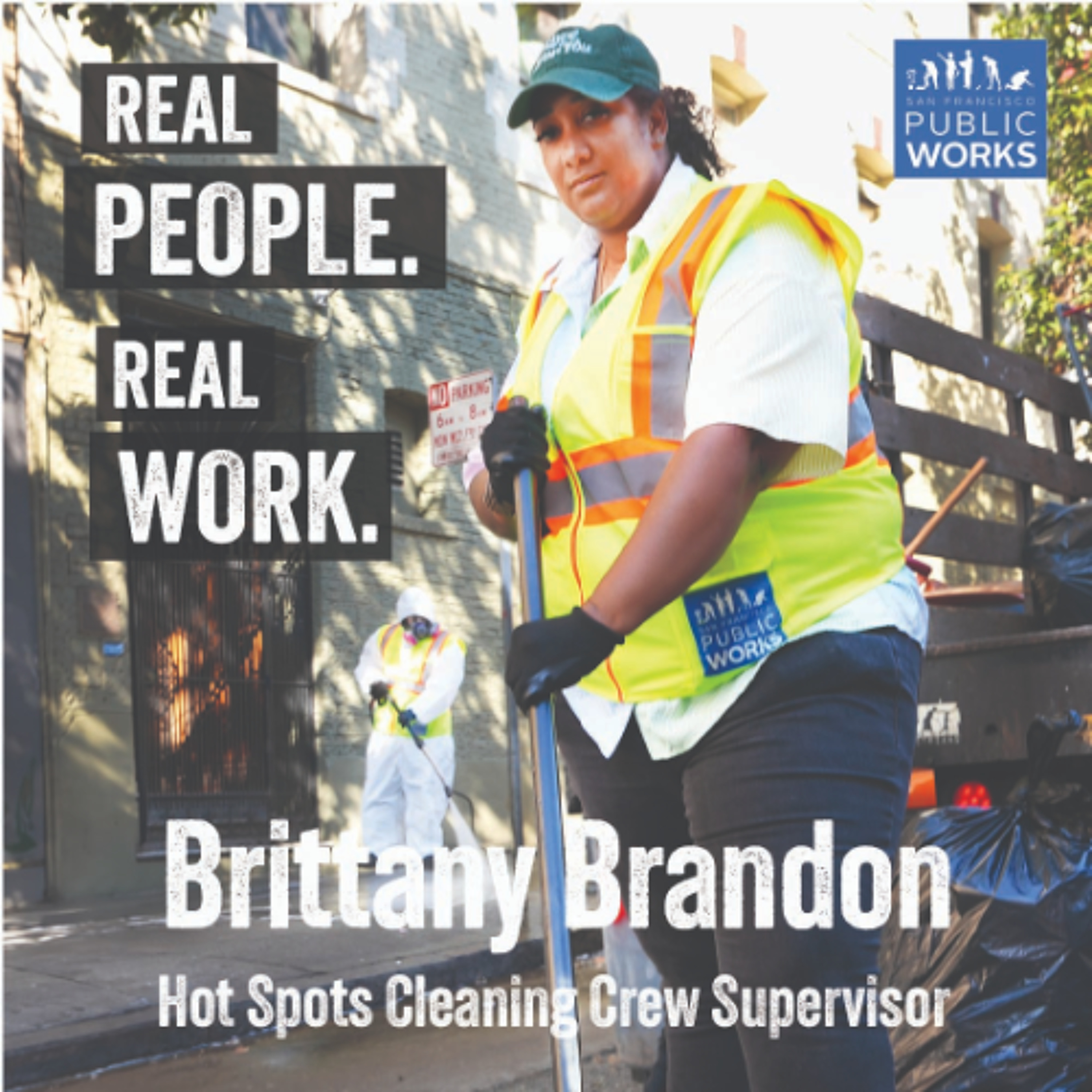 Brittany Brandon, a general laborer supervisor overseeing the Hot Spots crews for Public Works, grew up with the department. She joined Public Works when she was 18. After working as an apprentice with the department early on, Brandon rose through the ranks over the course of her career with Public Works, from sweeping streets and steam-cleaning alleys in North Beach to supervising cleaning crews assigned to encampment resolutions. A native San Franciscan, Brandon’s frontline work brought the city she loved ever closer.