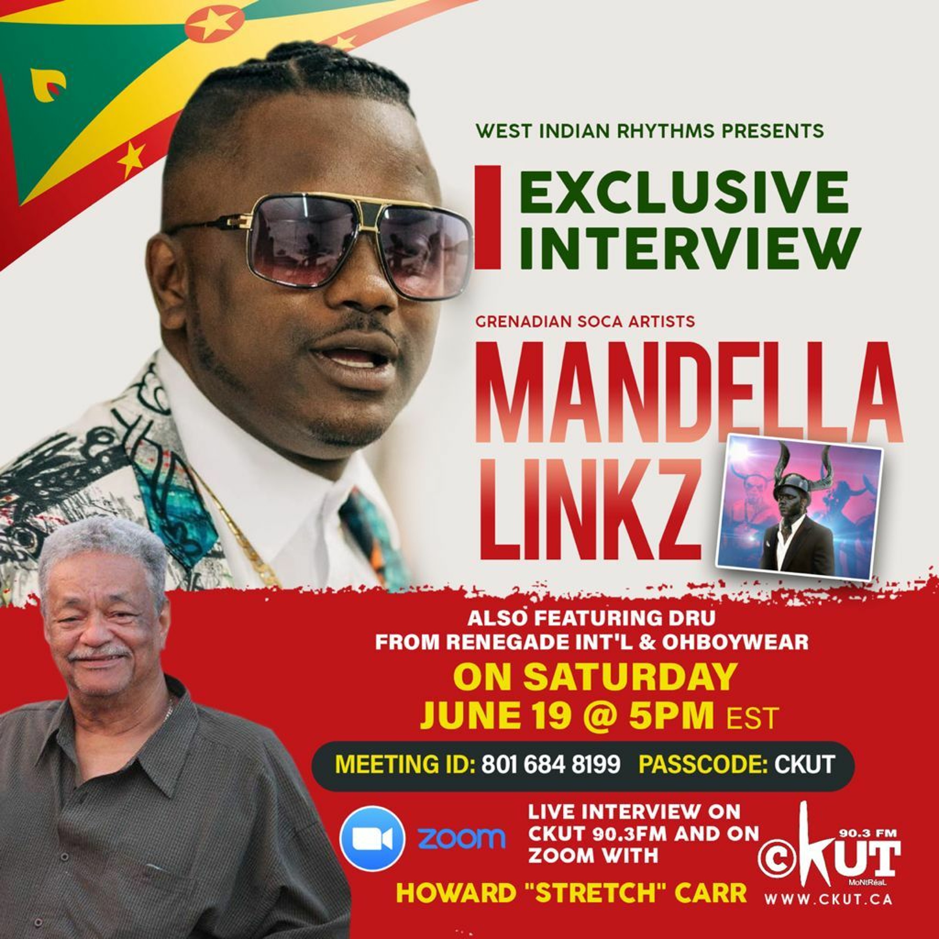Grenadian Soca Artist Mandella Linkz joins Dru from Renegade Int'l and OhBoyWear and Howard "Stretch" Carr in conversation on CKUT's West Indian Rhythms Sat June 19th 2021