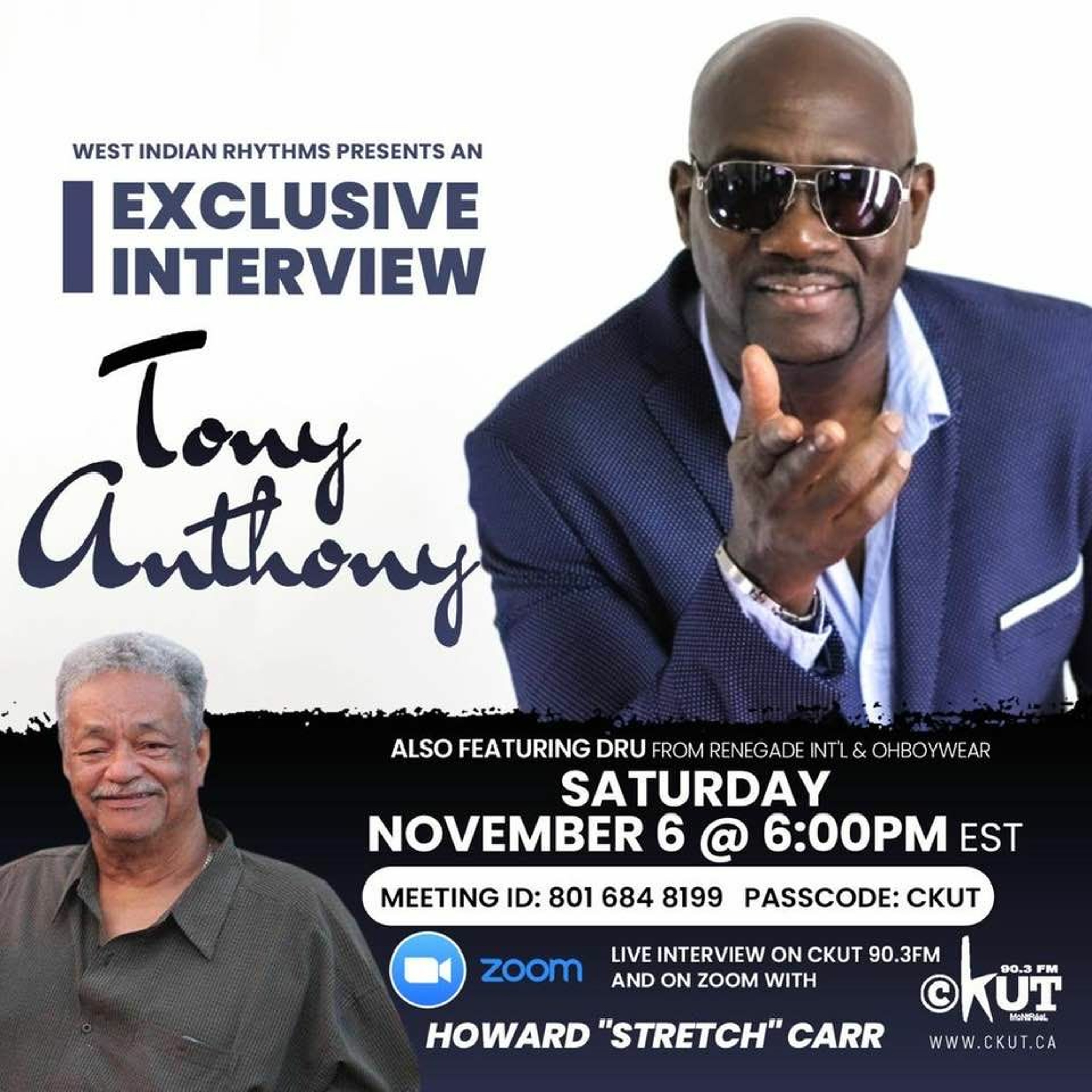 Jamaican born, currently residing in Toronto, Tony Anthony joins Howard "Stretch" Carr and Dru for a Quarantine Conversation Nov 6th 2021 on West Indian Rhythms, CKUT 90.3fm in Montreal.