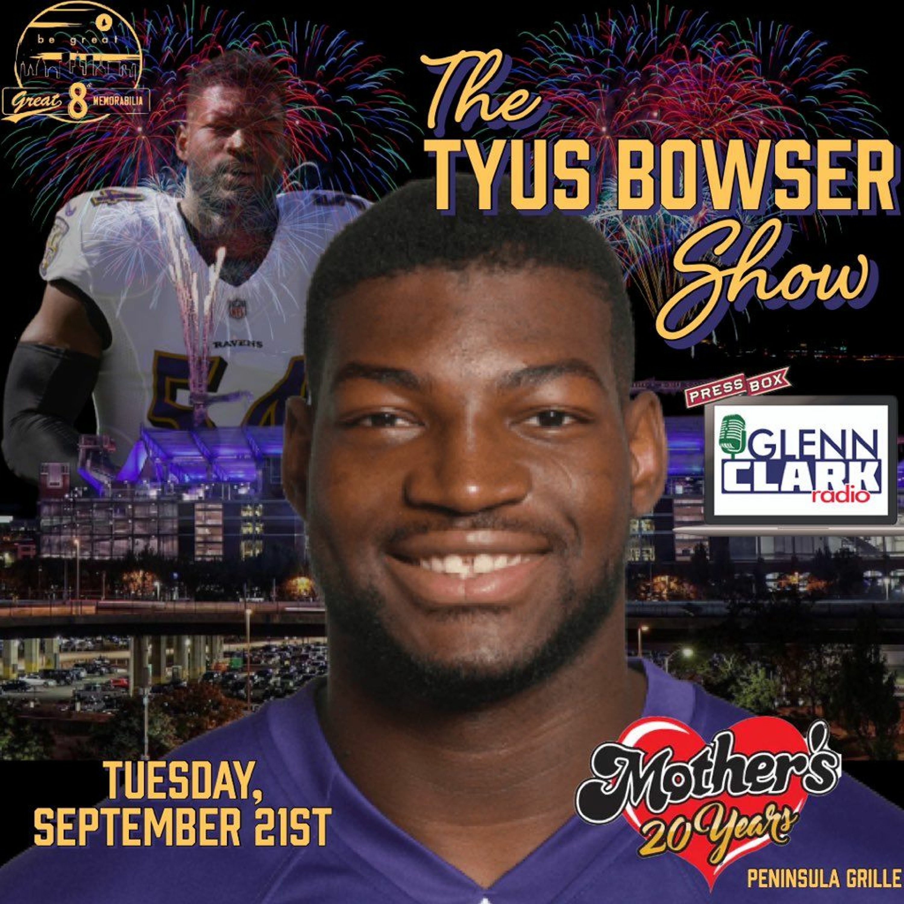 The inaugural Tyus Bowser Show from Mother's Peninsula Grille in Arnold feat. special guest "Co-Cap" Anthony Levine Sr. Glenn and the guys covered the massive win over the Chiefs, some background on both guys, Anthony's role as the "wise sage" on the team and more...
