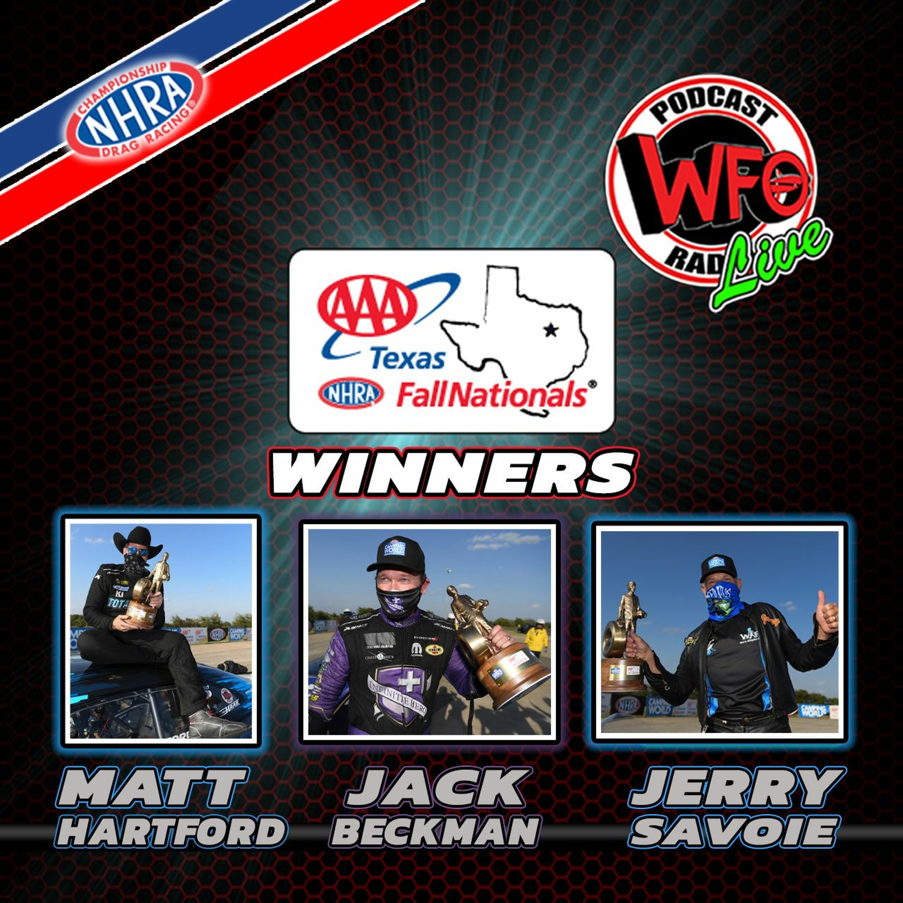 AAA Texas NHRA FallNationals Winners Matt Hartford, Jack Beckman, and Jerry Savoie discuss winning at the Texas Motorplex and heading to Houston. Host Joe Castello reflects on the passing of Crew Chief Eric Lane.