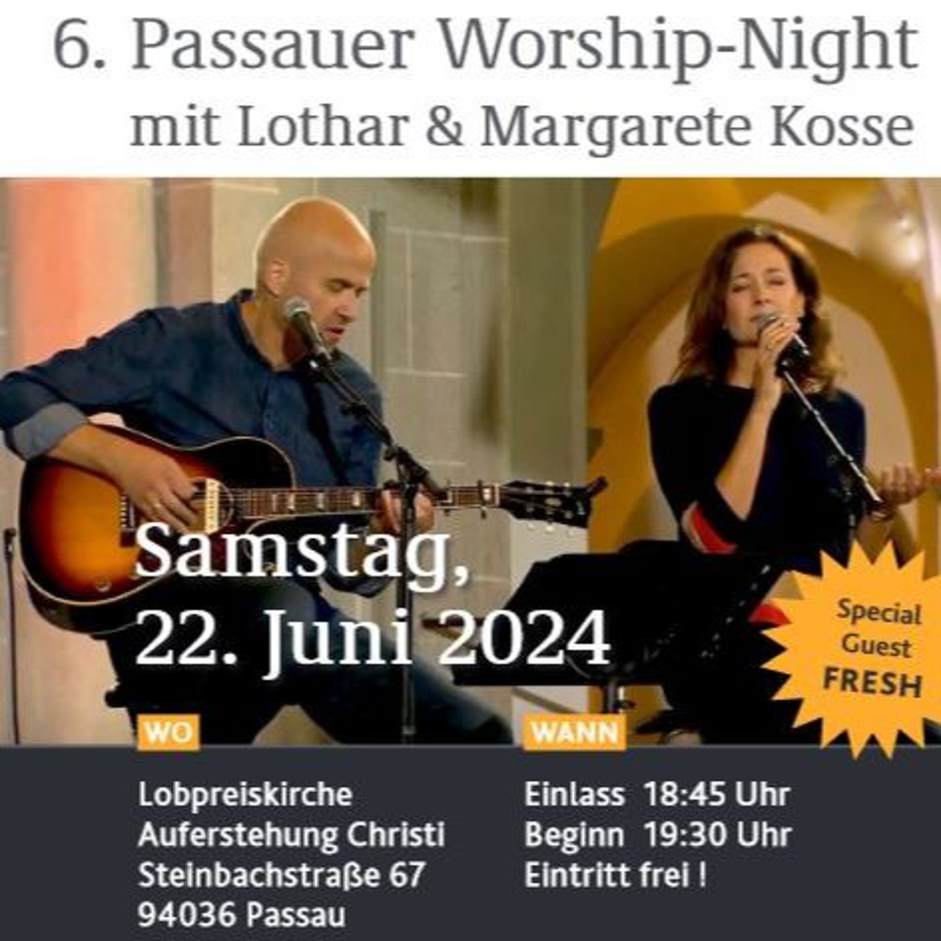 Am 22. Juni findet die 6. Passauer Worship-Night mit Lothar & Margarete Kosse statt. Ab 19:30 Uhr in der Lobpreiskirche „Auferstehung Christi“ in Passau-Neustift. Der Eintritt ist frei! Herzliche Einladung an alle! Mehr weiß Robert Guder, Leiter der Lobpreiskirche.