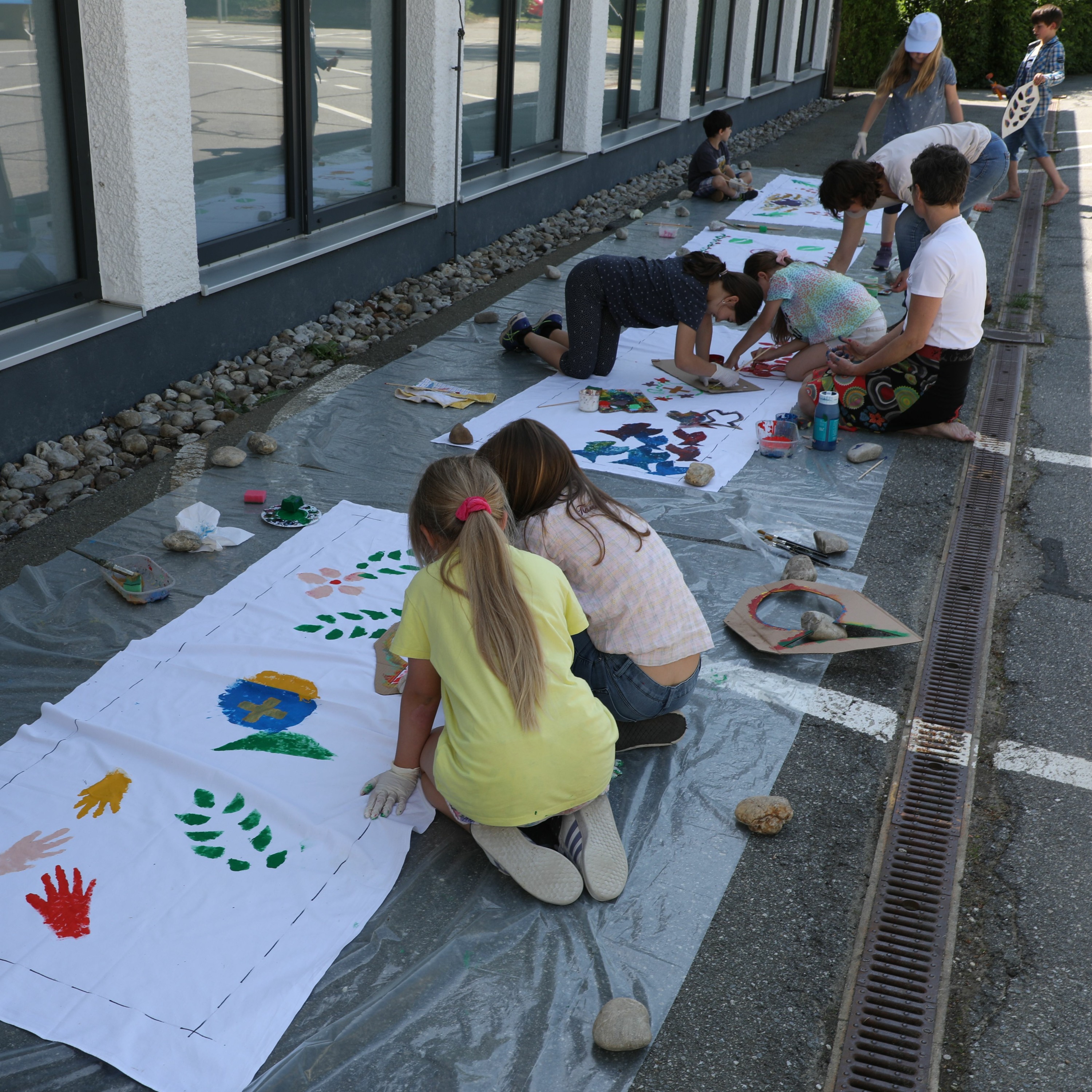 Die Kinder der 1. bis 4. Klasse der Grundschule in Aicha vorm Wald gestalteten zusammen mit der Organisatorin Barbara Westermeier und den beiden Künstlerinnen Marion Hafner und Carolin Nowecki farbenfrohe Hussen und ein Glaskreuz für Fronleichnam.