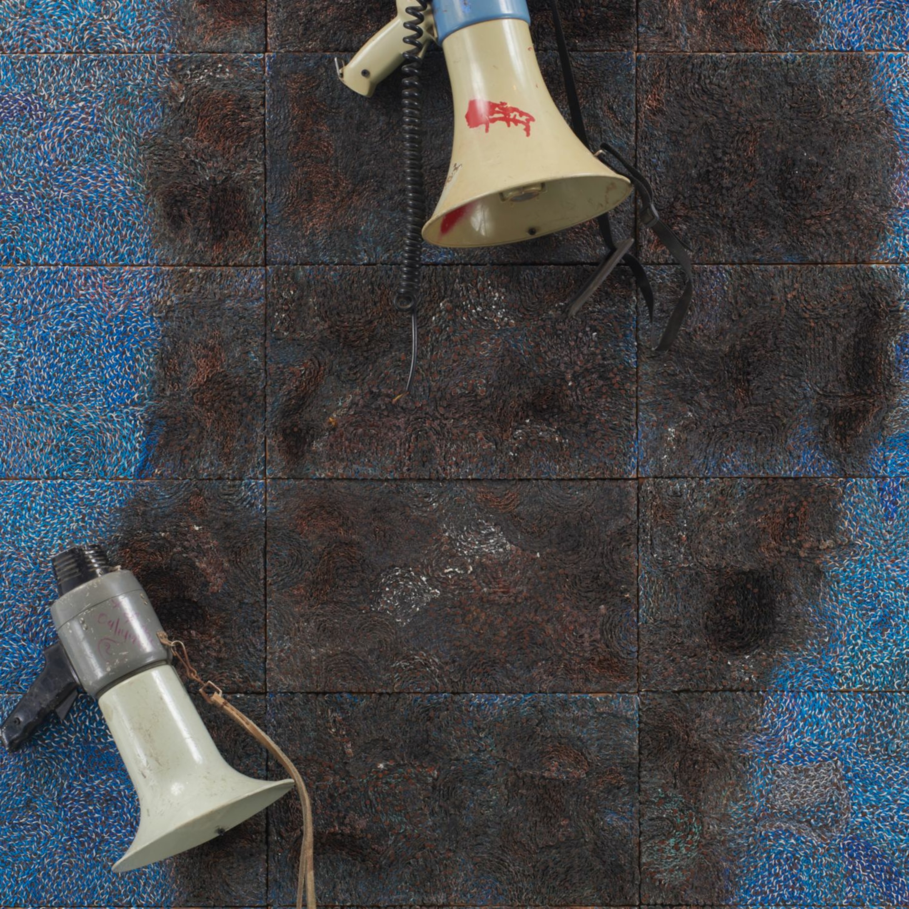 This is an audio description of Elias Sime's series of works titled 'Tightrope: Echo!?'.