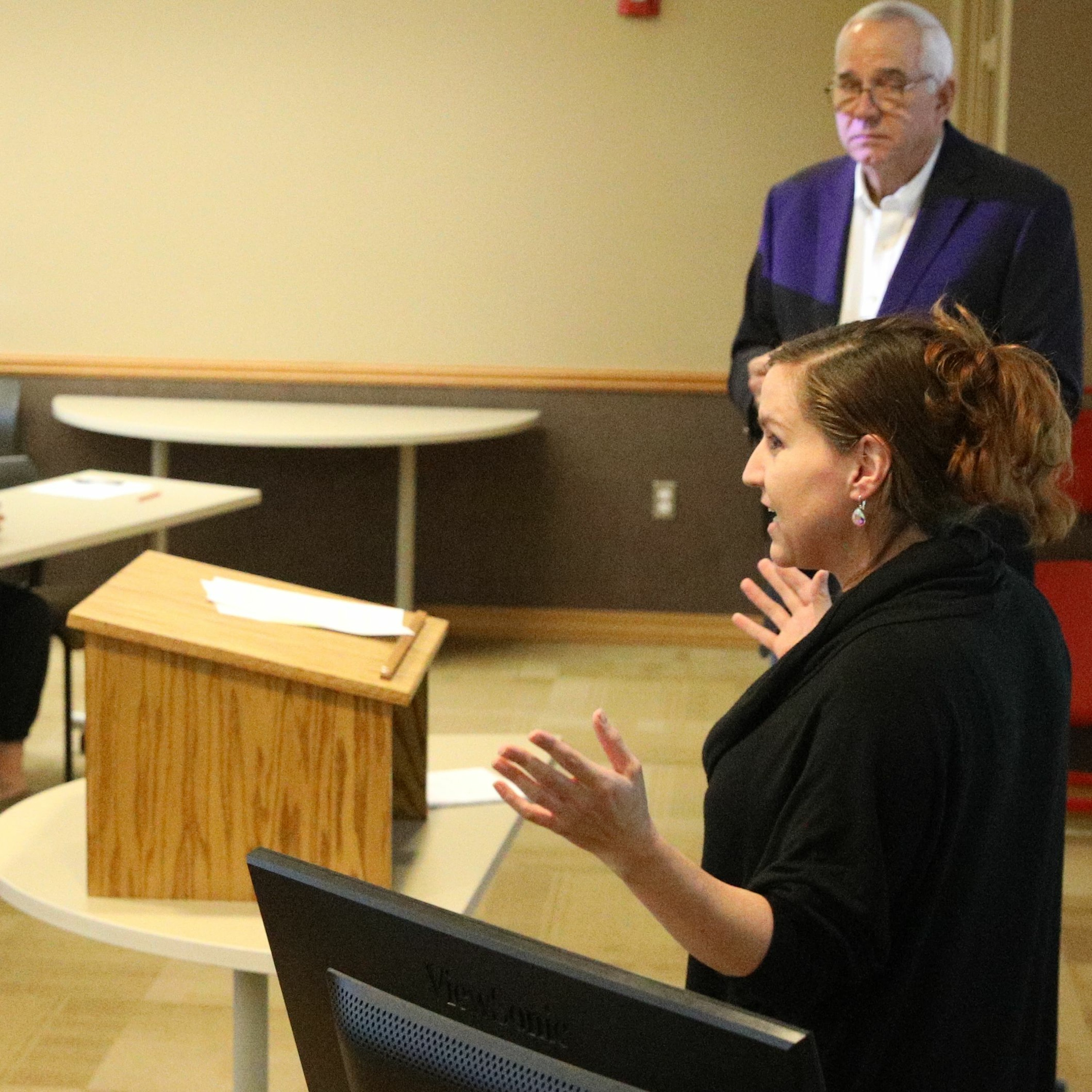 Students in business professor Amanda Cleland’s “Marketing” class are joined by business faculty member Tom Prince to assess the TV ads aired during #SuperBowlLVII.