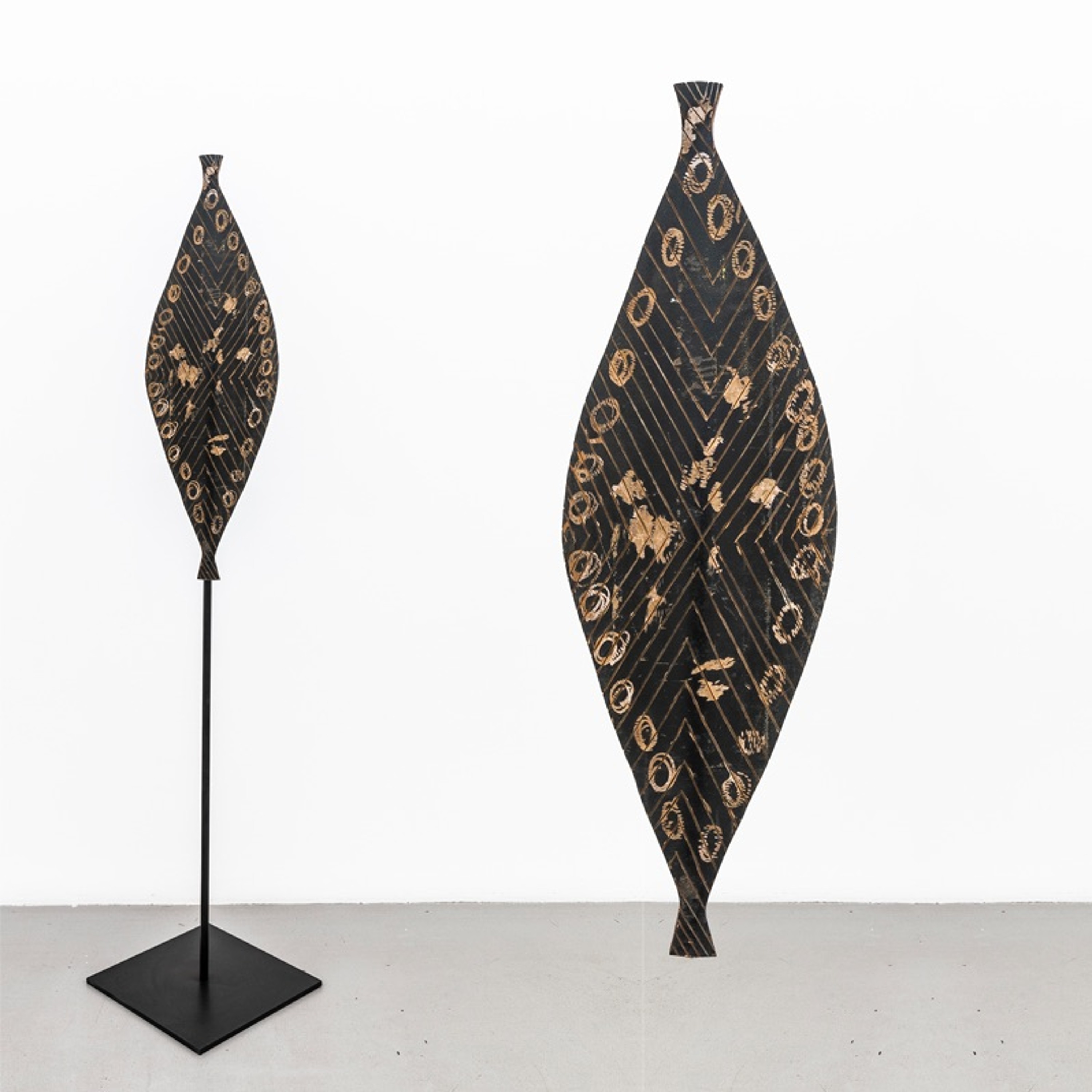 Standing at six feet tall, the sculpture “Nullius in Verba III” is intentionally the same height and weight as its sculptor, Steaphan Paton. The metal, diamond-shaped shield, mounted on a long pole, confronts the viewer. The shield’s surface is scratched, evoking the centuries of violence and dispossession faced by Paton’s ancestors. Among closer inspection, however, the sculpture is made from modern materials, asserting that this violence against Indigenous Australians is not an historic anecdote but a contemporary issue.