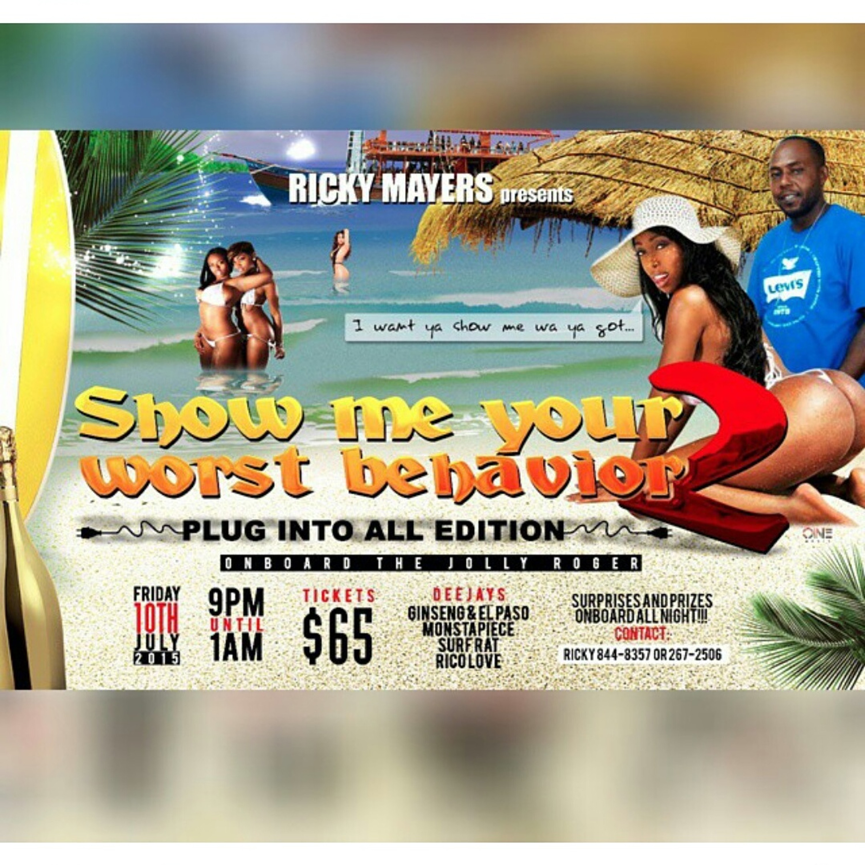 RICKY MAYERS PRESENTS SHOW ME YOUR WORST BEHAVIOR 2 PLUG IN TO ALL EDITION, JOLLY ROGER FRIDAY 10TH JULY, 9PM TIL 1AM, $65, DJS GINSENG & EL PASO, MONSTAPIECE, RICO LOVE, SURF RAT, CONTACT RICKY 8448357 / 2672506