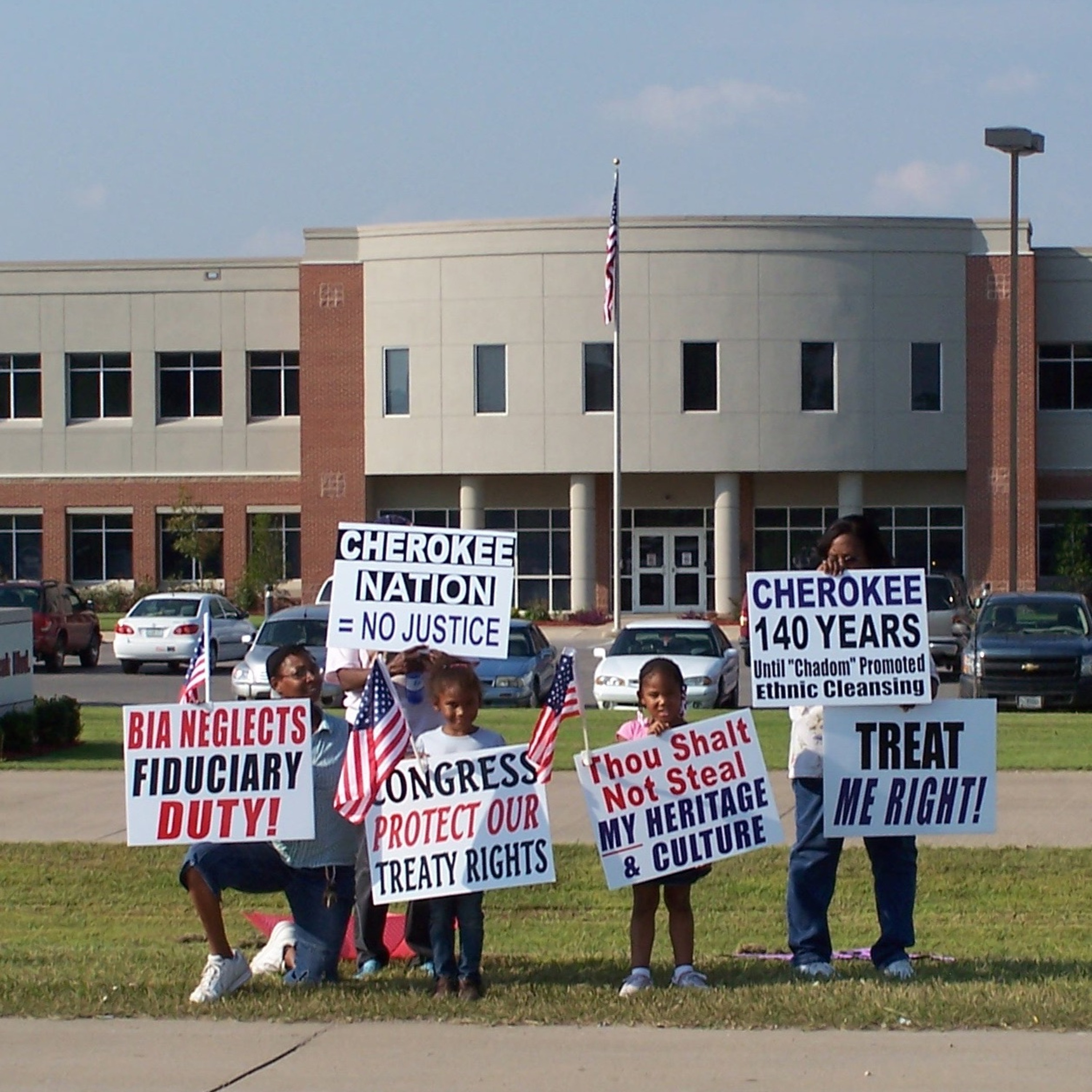 Photo of Cherokee Freedmen protest outside of the Bureau of Indian Affairs regional office in Muskogee, Oklahoma, courtesy Marilyn Vann, president of the Descendants of Freedmen of the 5 Civilized Tribes.