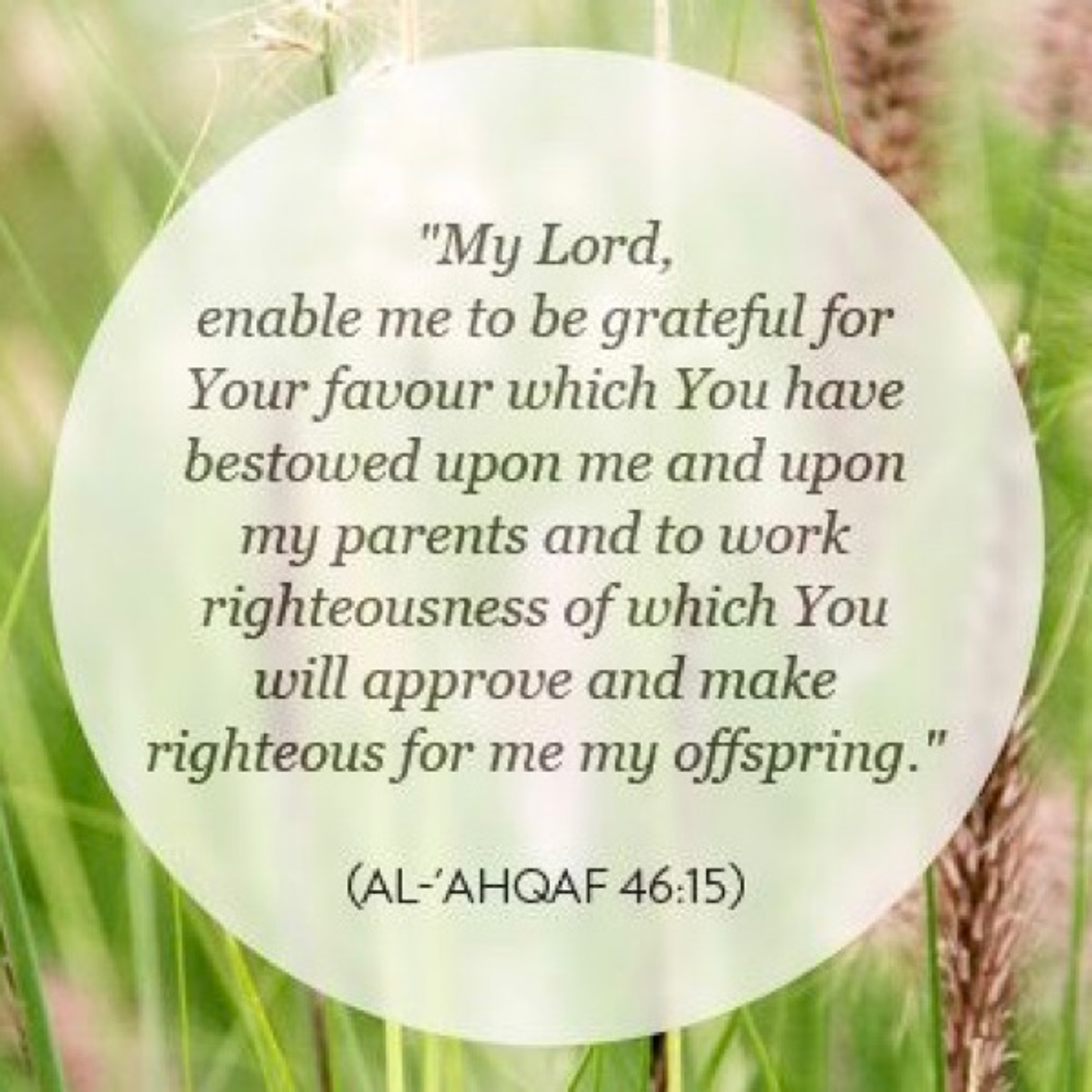 My Lord, enable me to be grateful for Your favor which You have bestowed upon me and upon my parents, and to work righteousness of which You will approve, and make righteous for me my offspring. Indeed, I have repented to You, and indeed, I am of the Muslims.
