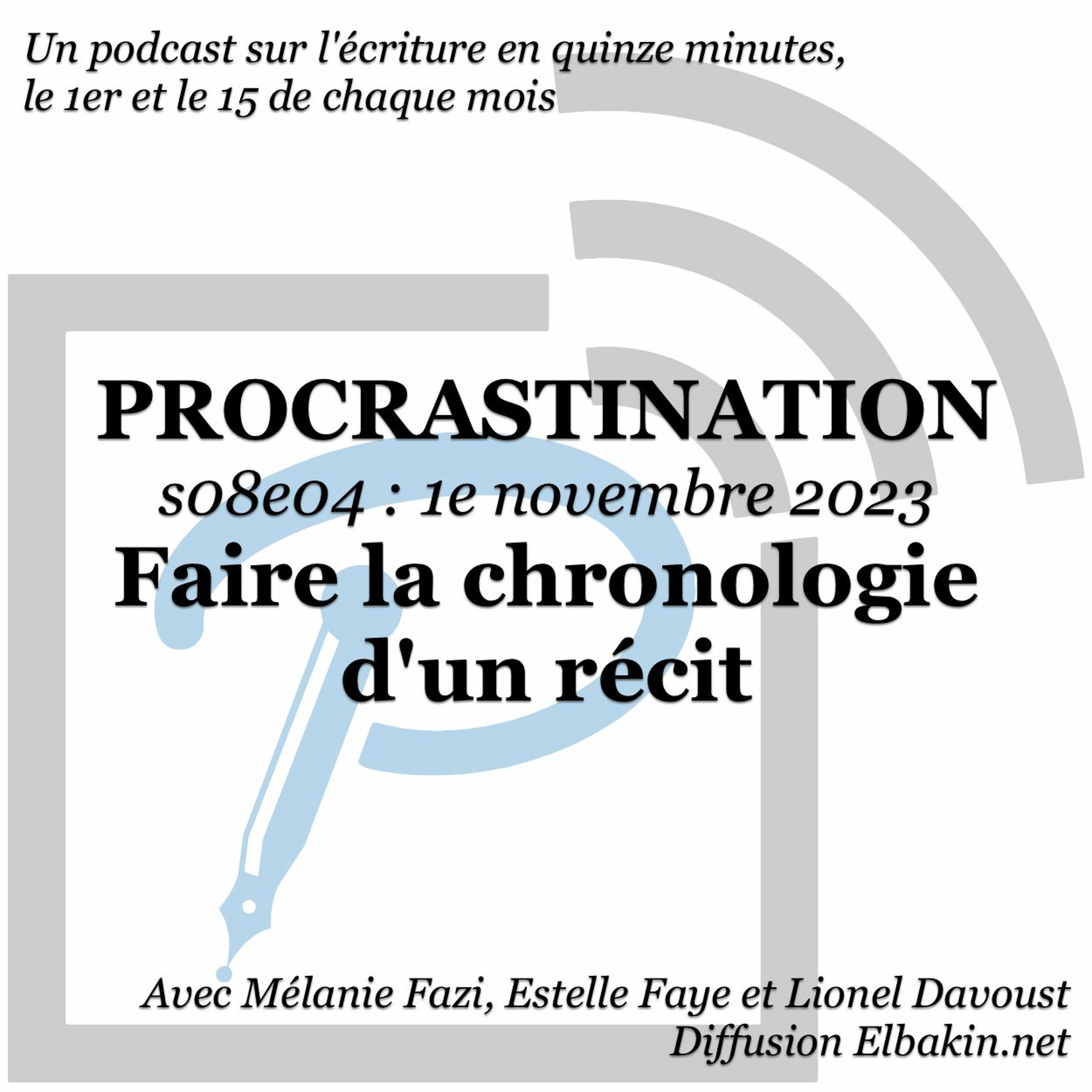 Cette quinzaine, Procrastination rentre dans le détail technique de cet outil fréquemment recommandé : quels outils, quelles méthodes pour construire la chronologie de son récit ? Lionel (qui essaie très fort de ne pas transformer l’épisode en panégyrique pour Aeon Timeline) propose de l’utiliser pour la construction a priori, tant que pour vérifier la cohérence des fils narratifs a posteriori. Estelle ajoute à cela les ruptures intéressantes que le récit peut proposer, comme les retours en arrière et sauts en avant ; la chronologie peut ainsi s’avérer un outil précieux pour dynamiser sa narration. Mélanie rappelle qu’on peut aussi toujours écrire des récits qui permettent de faire l’abstraction de tout ce bazar !