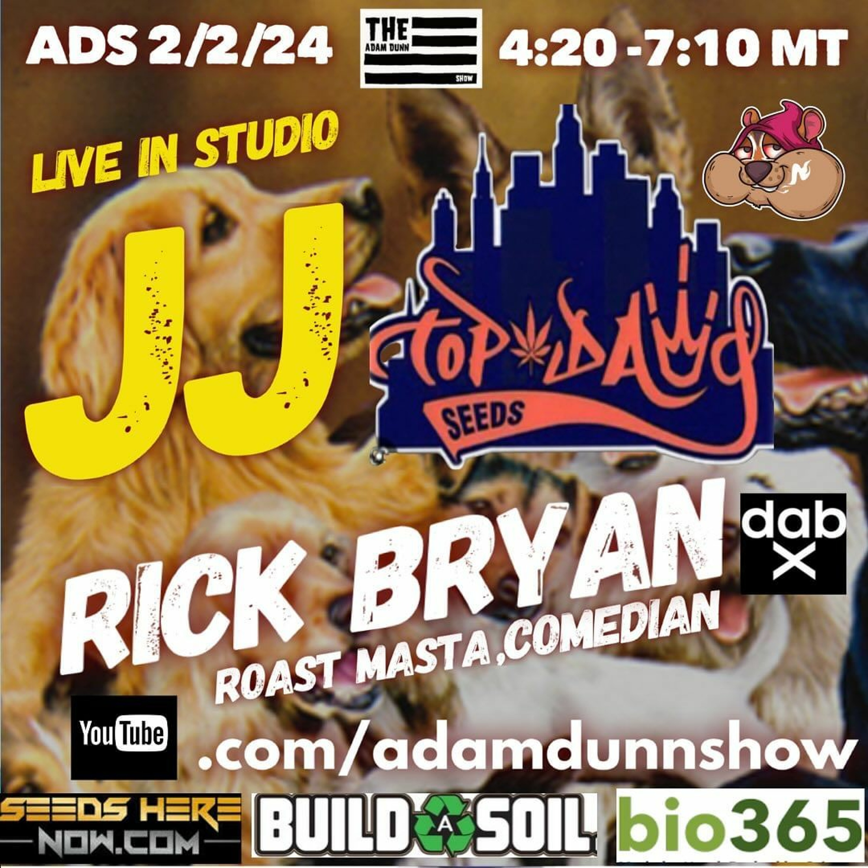 Who let the Dogs out ? Who who who who…..We have the pack leader JJ from @therealtopdawgseeds live in the studio. When it comes to Chems and Sour this is one breeder that has ALWAYS been deep in that freshly cracked tennis ball /pool liner/Dirty Taxi pocket. If those terps aren’t your style maybe a Piffy, metallic Nag Champa is more your style. We will unpack all these Terps, and whatever else might be on his radar. He can load up our new steal your face from @stundenglass rig and if he’s lucky, Vinny will break out the @jerome_baker nitro bong. Also live in the studio we have comedian and Roast Masta @rickbryancomedy Denver local and national act Rick has played them all. Let’s hope he loves the mota as much as loves the Nuggets and Broncos …at least @faceofbass will pay attention ( did someone say Nuggets?) So get that @dabx GO rig charged your @jerome_baker bong Clean with some 🧊 for good measure and your @yoproductsllc Yo-Tips ready to rock for another three hour edition of youtube.com/adamdunnshow 4:20 to 7:10 MT❤️