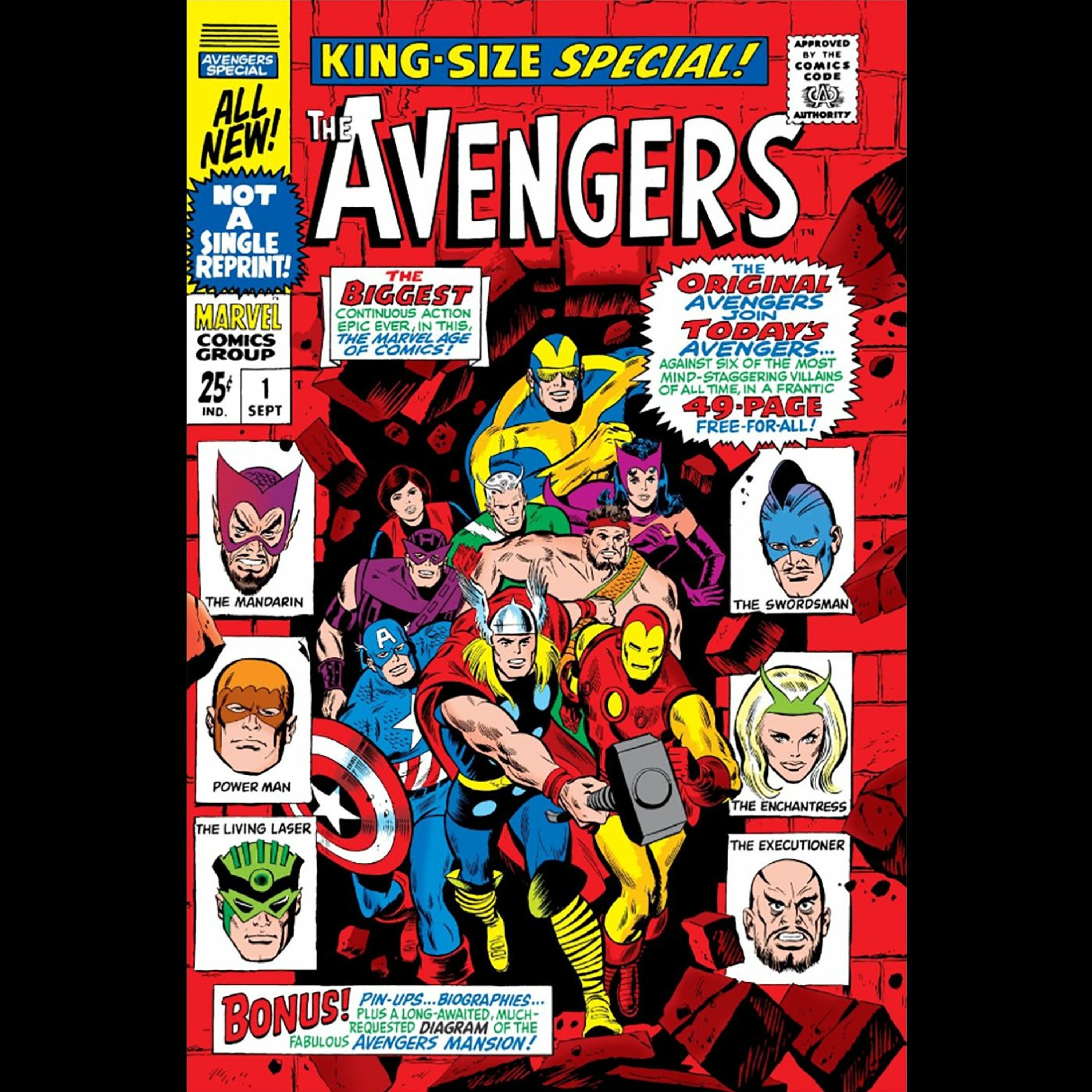 In our first Avengers Annual issue, a fully assembled Avengers team faces off against the machinations of the maniacal Mandarin and the super-villains that he has arrayed before him. A sprawling, 50 page adventure that was the longest single Marvel story written up until that time, this issue is a raucous expedition across the globe and even in to outer space!
