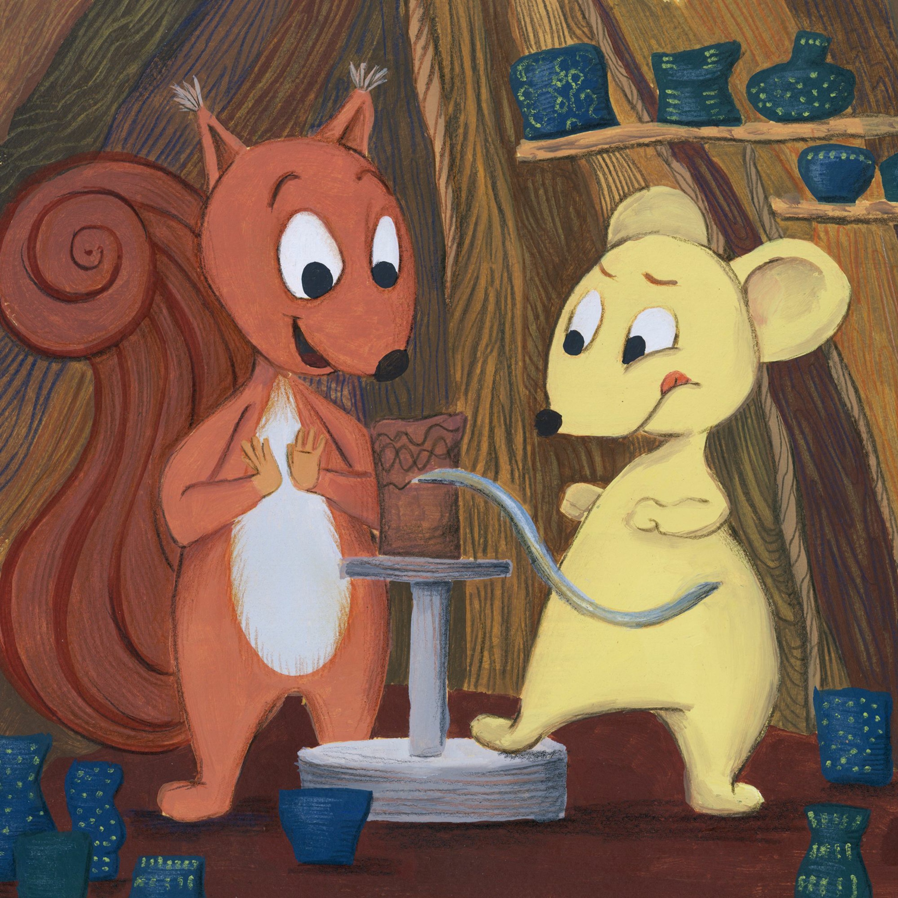 Pravljico Pri veverici lončarki pripoveduje Mara Gostinčar. Napisala jo je Tinka Bačič, ilustrirala Anja Držanič.