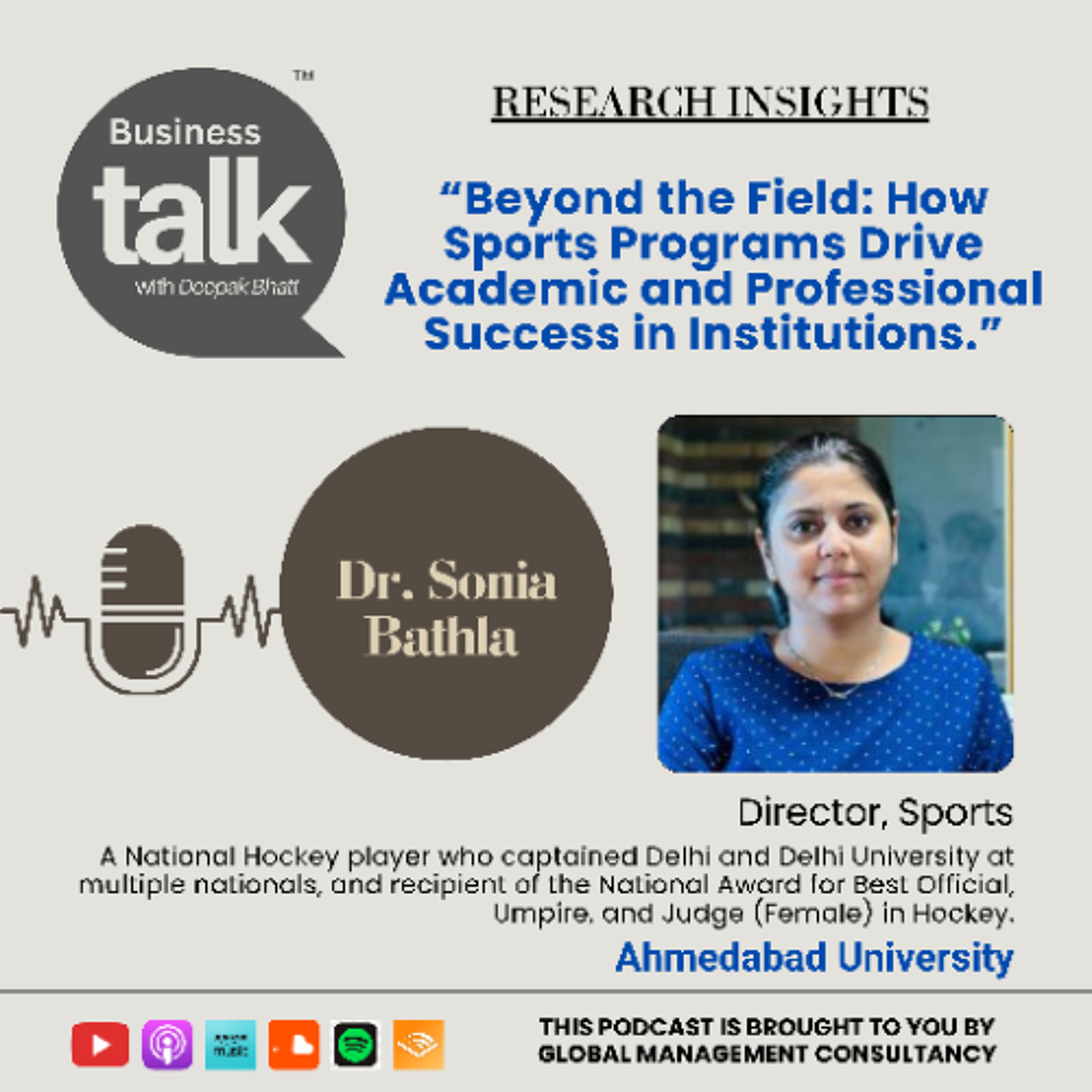 B. Dr. Sonia Bathla generously shared profound insights from her groundbreaking research, “Beyond the Field: How Sports Programs Drive Academic and Professional Success in Institutions,” during her appearance on the Business Talk podcast channel. The uploaded video contains copyrighted material; therefore, any modifications to graphics, music, or the presence of the author or host are strictly prohibited.