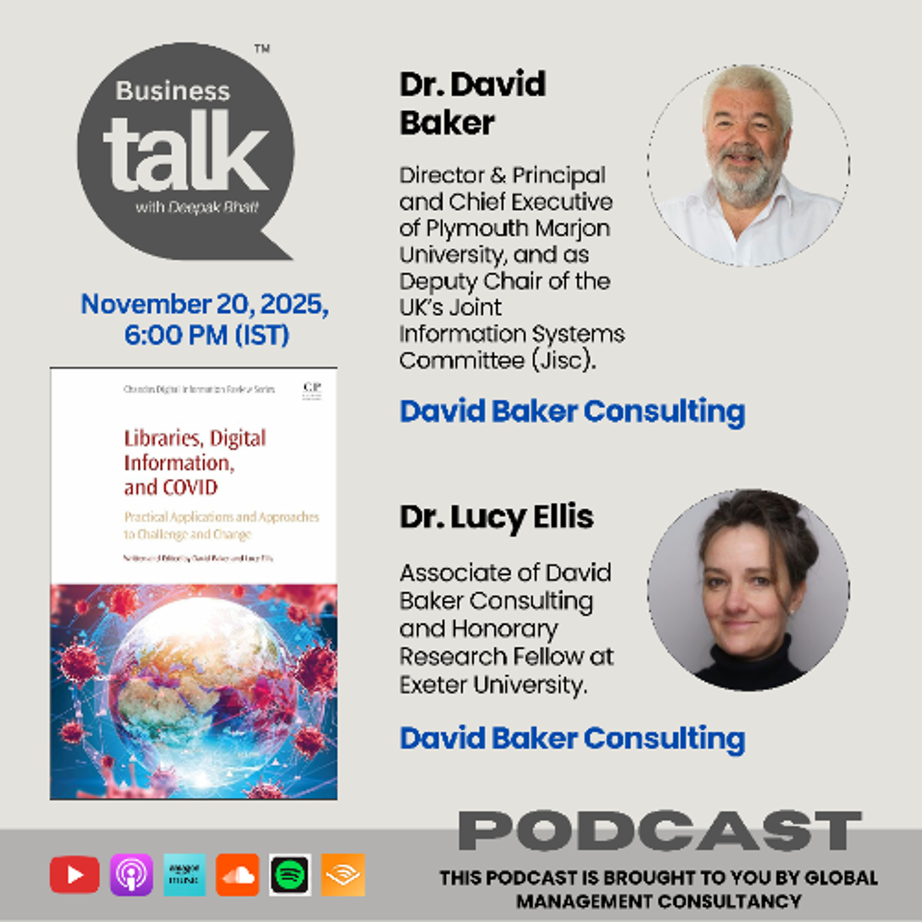 B. Dr. David Baker and Dr. Lucy Ellis generously shared profound insights from their book, “Libraries, Digital Information, and COVID: Practical Applications and Approaches to Challenge and Change”, during their appearance on the Business Talk podcast channel. The uploaded video contains copyrighted material; therefore, any modifications to graphics, music, or the presence of the author or host are strictly prohibited.