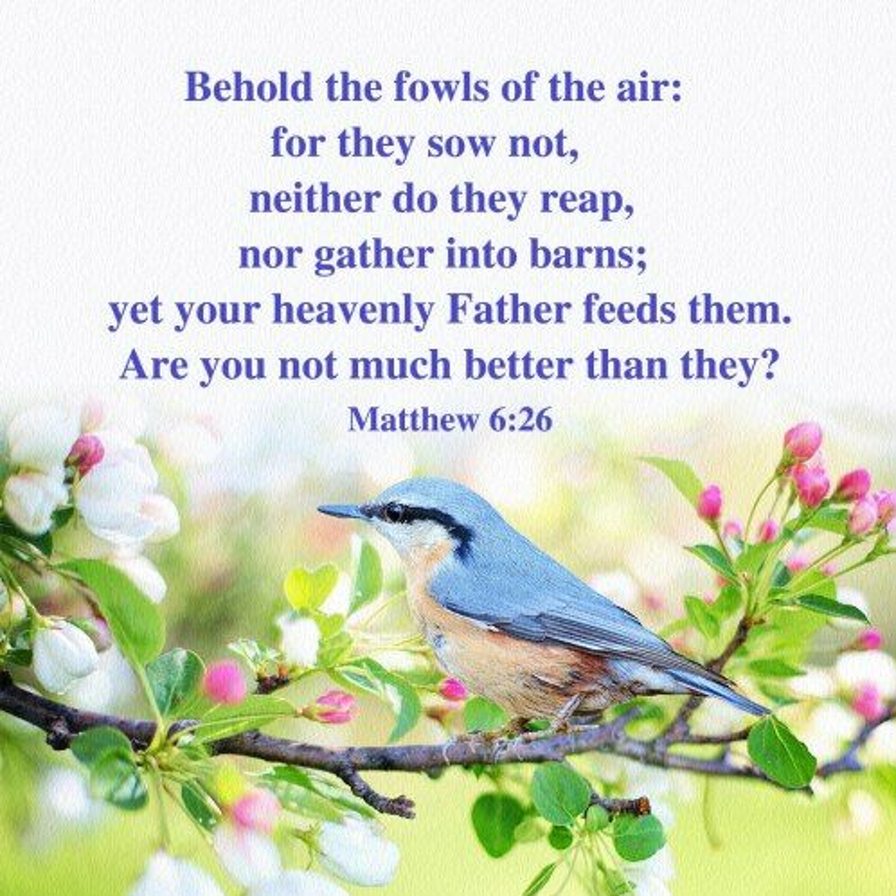 Matthew 6:26, KJV: Behold the fowls of the air: for they sow not, neither do they reap, nor gather into barns; yet your heavenly Father feedeth them. Are ye not much better than they?