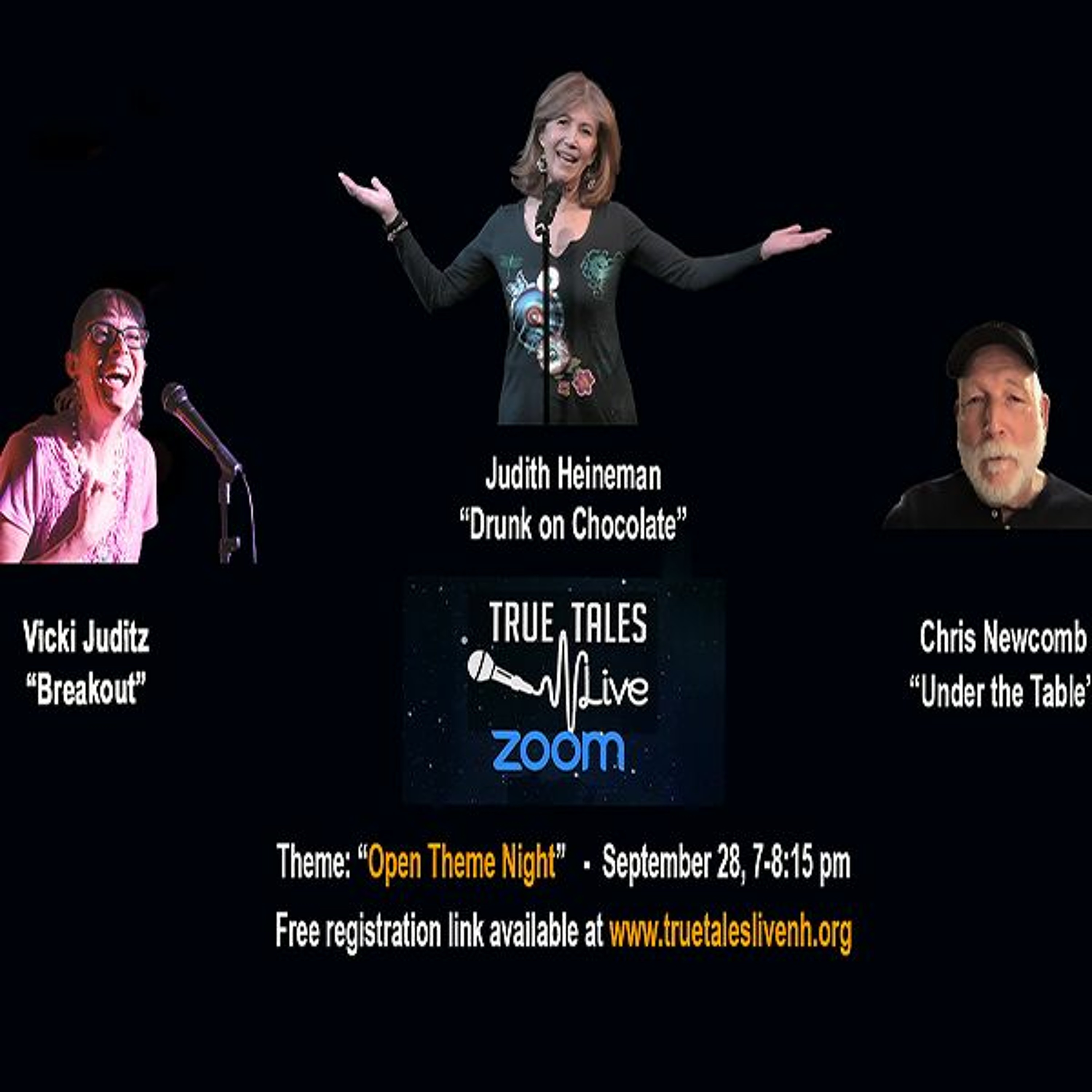 Our first ZOOM show after our Summer Hiatus... Open Theme Night featuring three very talented storytellers. Announcer/Host: Amy Antonucci. Emcee: Pat Spalding Storytellers and their story titles in order of play: Judith Heineman "Drunk on Chocolate;" Chris Newcomb "Under the Table;" and Vicki Juditz "Breakout." This program was done before a live ZOOM audience. There is a second file available on this podcast of the "Backstory Interview of storyteller Judith Heineman conducted by David Phreaner. The Video version of the entire program will be available on demand at https://www.youtube.com/user/ppmtvnh/playlists - In the True Tales Live Playlist. It will also be aired on Comcast Channel 98 in the Seacoast area of NH. Visit our website at www.truetaleslivenh.org or our Facebook page truetaleslive. Audio/Video Editor: John Lovering.