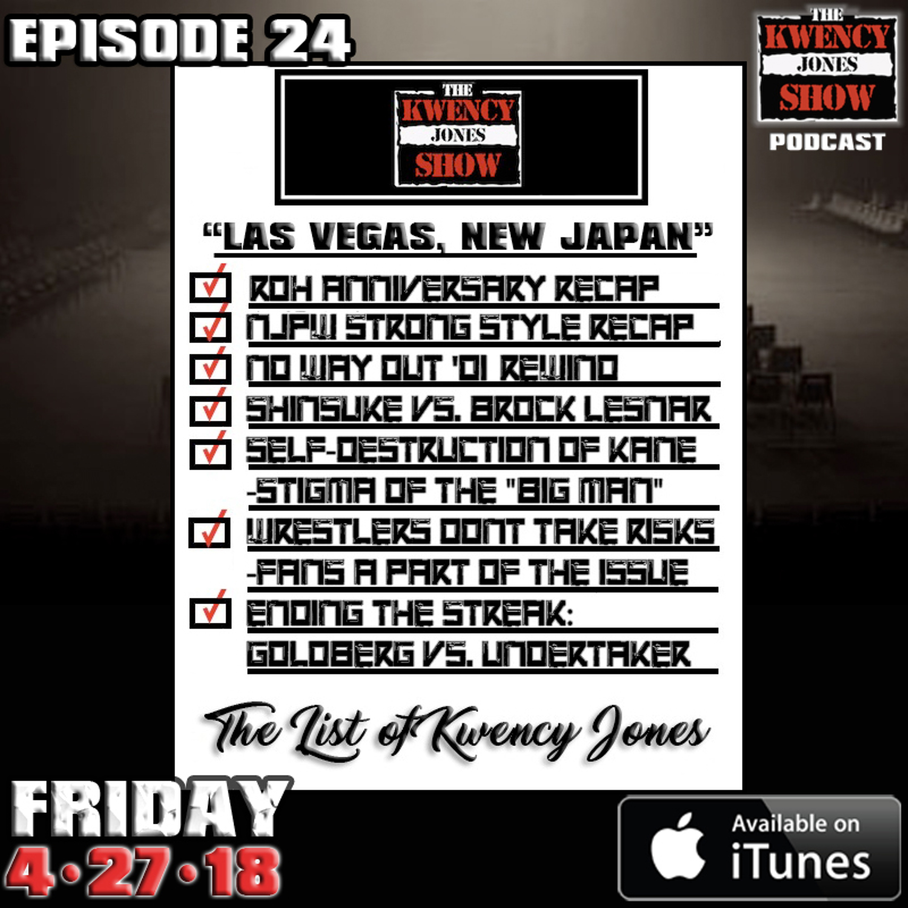 "Las Vegas, New Japan" - It's Episode 24 & we're back with a recap episode! First we record live in Las Vegas for Ring of Honor's 16th Anniversary Show, then myself & Marc McFly discuss our experience at NJPW's "Strong Style Evolved" event in Long Beach, CA. We also analyze WWE's 'self-destruction' of Kane, question 'What If Shinsuke picked Brock instead of AJ Styles?', plus we serve out some nostalgia wtih No Way Out 2001. #thekwencyjonesshow