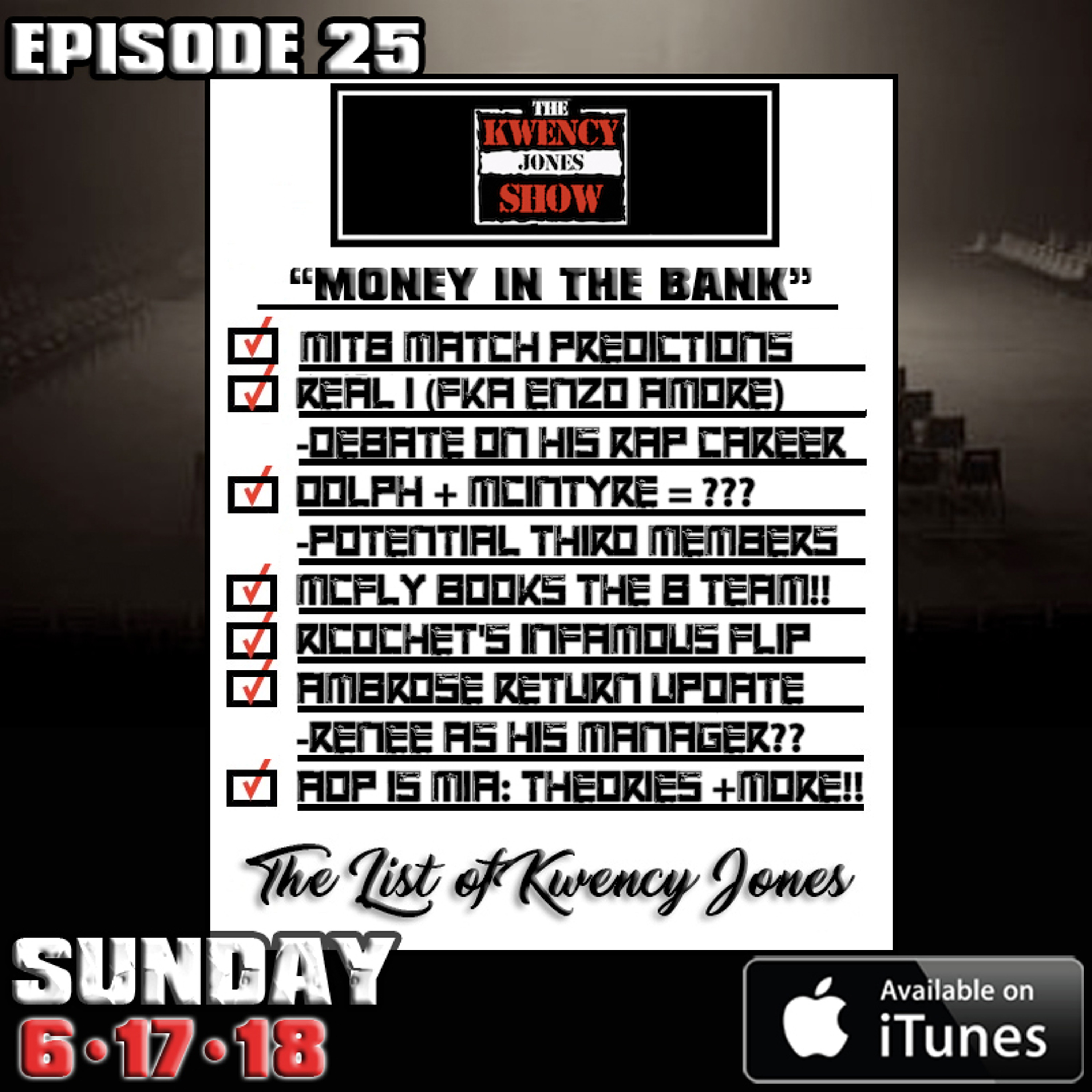 "Money In The Bank" - The Gawd Squad is back together after hiatus for a special 25th episode of the podcast. We throw down our MITB predictions, call out the writers assigned to the Women's Division for their lack of creativity, plus we ask the hard questions like: WTF are the Authors Of Pain?! Yes, we talk about THAT flip, and tell the WWE to take notes cuz McFly is booking The B Team!! Enjoy & Subscribe. #thekwencyjonesshow