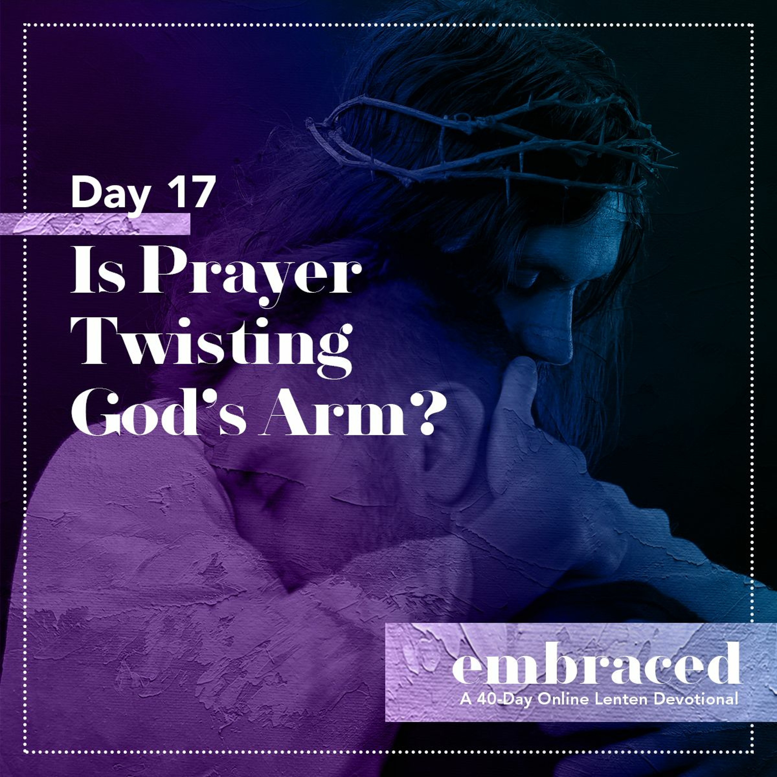 DAY 17: For many people, prayer means changing God's mind. For some, prayer is "convincing God to bless you." But God is a parent. And by nature, parents are providers. God is a parent, and He wants to provide for us. The Bible says that God delights in the prosperity of His servant. This Lent, come as you are and let God embrace you.