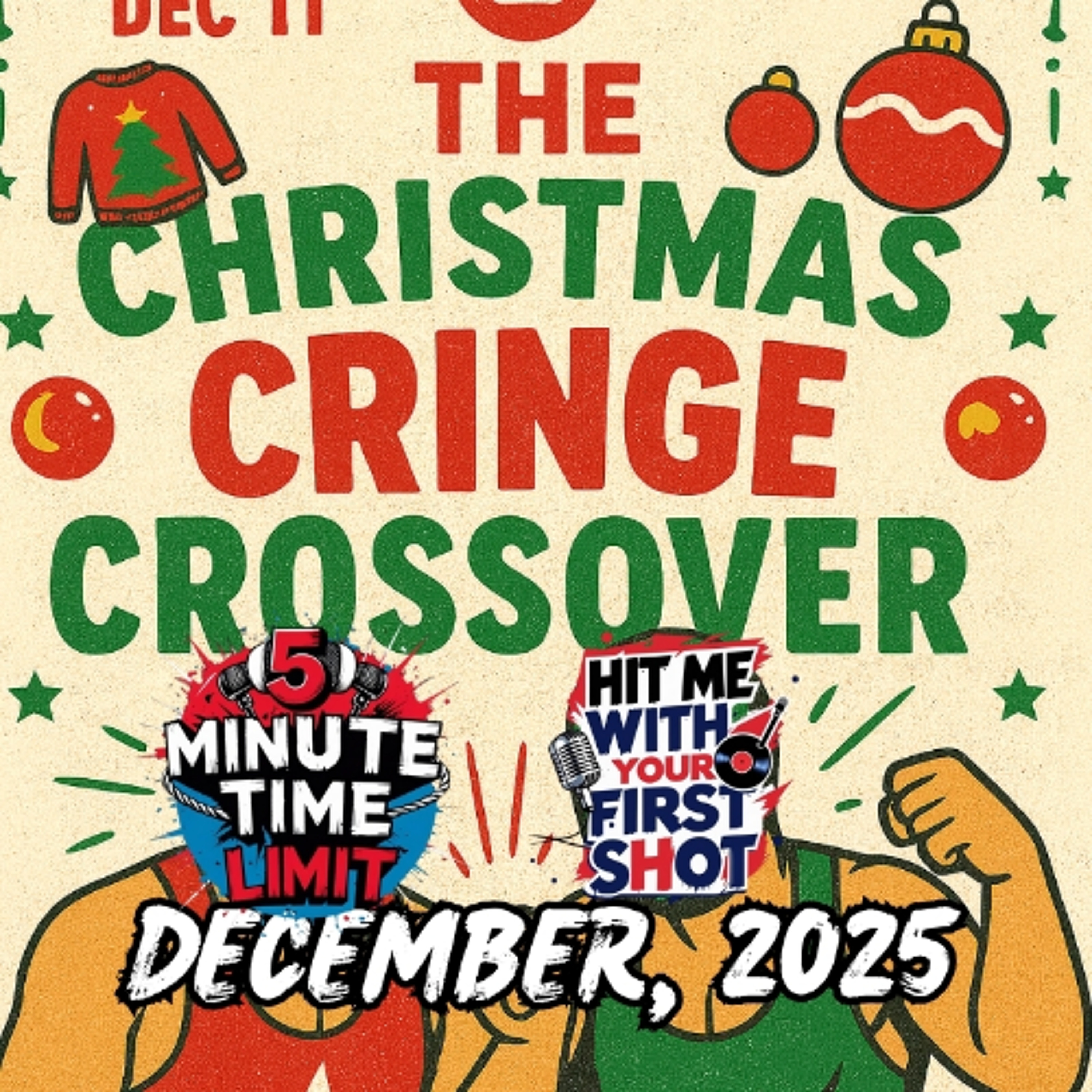 Join 5 Minute Time Limit and Hit Me With Your First Shot for The Christmas Cringe Crossover! One night only on Thursday, December 11th at 7:05 CST, guests step into the holiday ring wearing their ugliest sweaters or funny Christmas graphic Ts! and bringing along their most hated Christmas songs. They’ll rant, roast, and completely bury the tunes they can’t stand, and they’ll also reveal the absolute worst Christmas presents they’ve ever received — from socks and fruitcake to gifts so bad they’re practically holiday trauma. It’s music, it’s wrestling, and it’s chaotic fun wrapped in tinsel. Don’t miss The Christmas Cringe Crossover, only from STSPod.club — the gift you didn’t ask for, but you’re going to love anyway.
