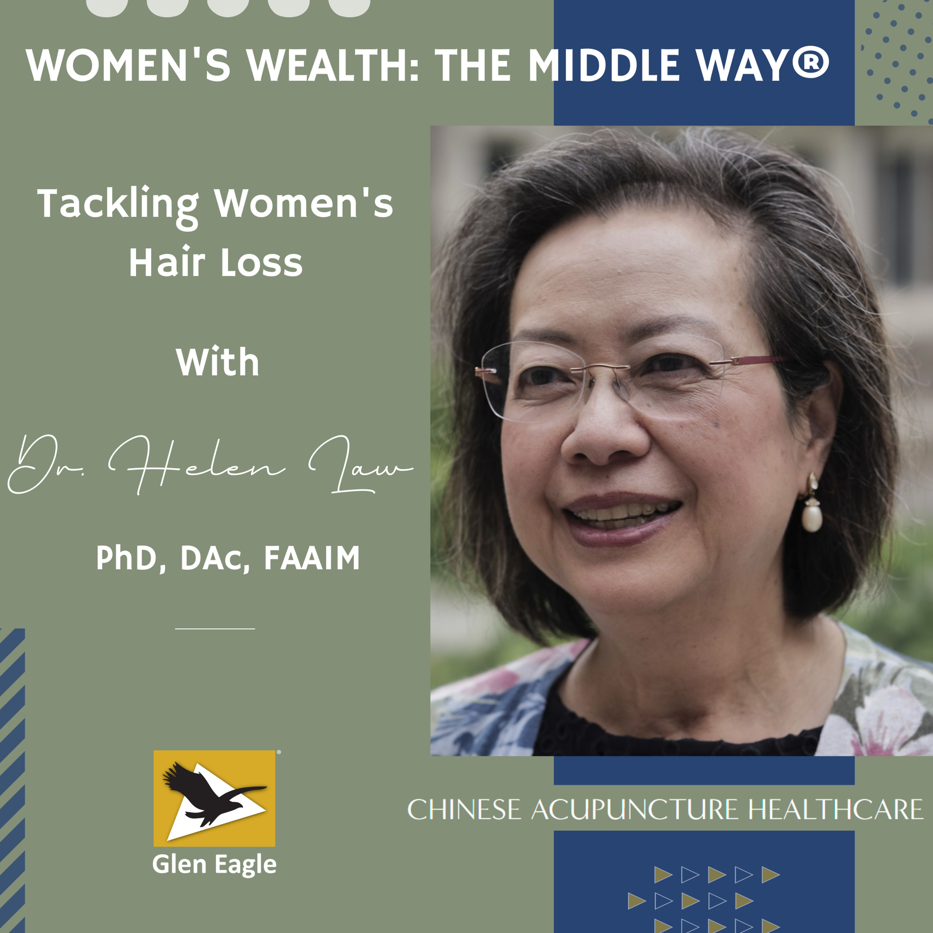 Dr. Helen Law joins us on today to talk about a topic that affects millions of women worldwide - hair loss. It's a common problem that can have a profound impact on a woman's confidence and self-esteem. Listen in as Dr. Law shares valuable insights and advice on what causes hair loss in women, what to look for, and what you can do about it. Dr. Law is a licensed acupuncturist who has practiced Chinese Medicine for over 21 years. She has been voted NJ Top Docs since 2010 and the best Acupuncturist in Princeton, NJ, since 2008. Dr. Law recently published a book, and she frequently speaks on Chinese Medicine topics. Join us on the third Wednesday of each month on , a radio show aimed at helping women navigate questions about work, money, and family. You can find us on your favorite podcast app, including , , , . For podcast updates straight to your inbox, visit . See you next month! Helpful Links: Dr. Helen Law: Chinese Acupuncture Healthcare and Allergy Care Center: Neuropuncture: Case Studies and Clinical Applications: Vol.1: Women's Wealth: The Middle Way®: Glen Eagle: Disclaimer: Glen Eagle does not endorse, approve, recommend, or certify any information, product, process, service, or organization presented or mentioned in this Podcast, and information from this Podcast should not be referenced in any way to imply such approval or endorsement.