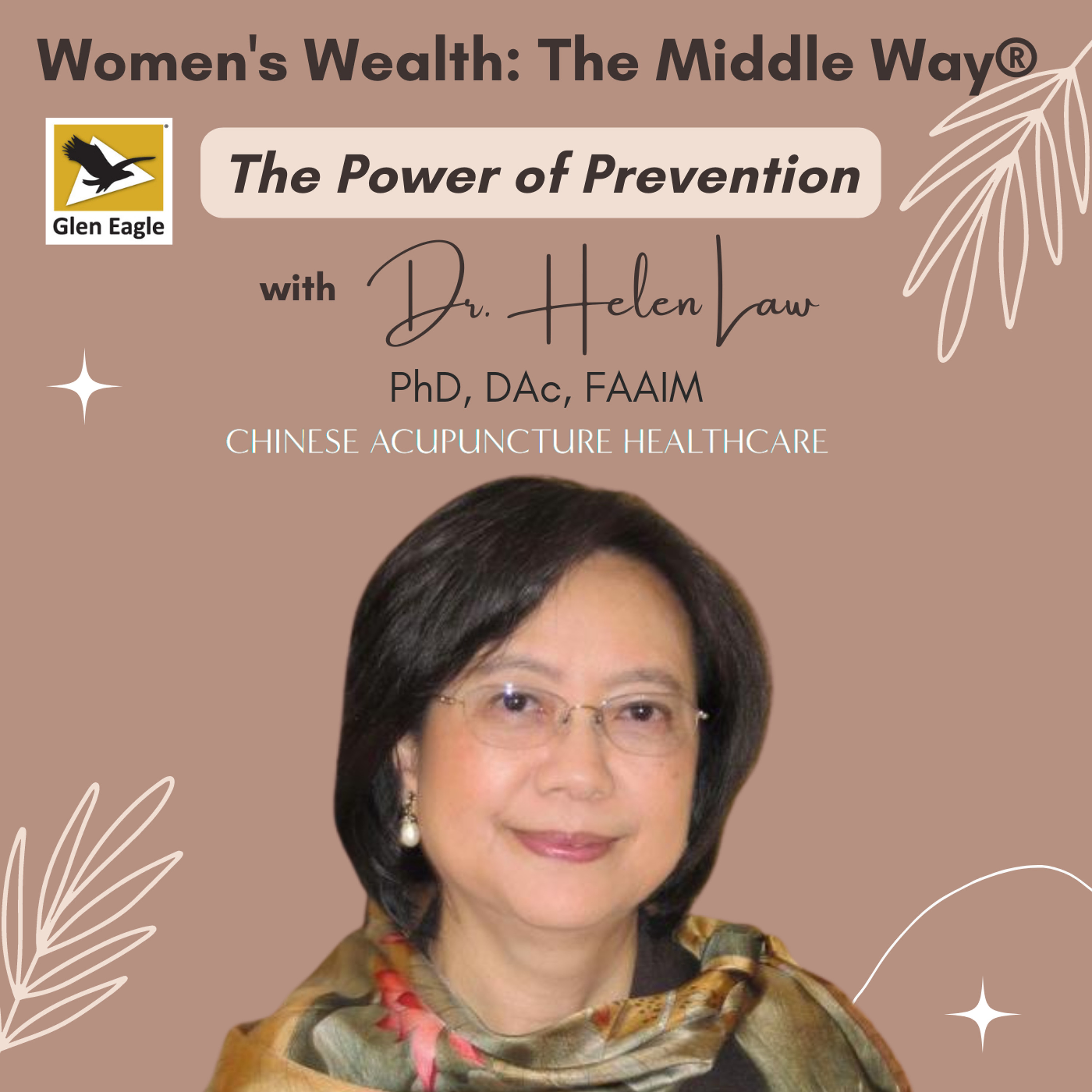 Dr. Helen Law joins us on today to talk about women's health issues, including cardiovascular disease, high blood pressure, metabolic syndrome, and diabetes. Dr. Law is a licensed acupuncturist who has practiced Chinese Medicine for over 21 years. She has been voted NJ Top Docs since 2010 and the best Acupuncturist in Princeton, NJ since 2008. Dr. Law recently published a book and she frequently speaks on Chinese Medicine topics. Join us every other week on , a radio show aimed at helping women navigate questions about work, money, and family. You can find us on your favorite podcast app, including , , , . For podcast updates straight to your inbox, visit . See you in two weeks! Helpful Links: Dr. Helen Law: Chinese Acupuncture Healthcare and Allergy Care Center: Neuropuncture: Case Studies and Clinical Applications: Vol.1: Women's Wealth: The Middle Way®: Glen Eagle: Disclaimer: Glen Eagle does not endorse, approve, recommend, or certify any information, product, process, service, or organization presented or mentioned in this Podcast, and information from this Podcast should not be referenced in any way to imply such approval or endorsement.